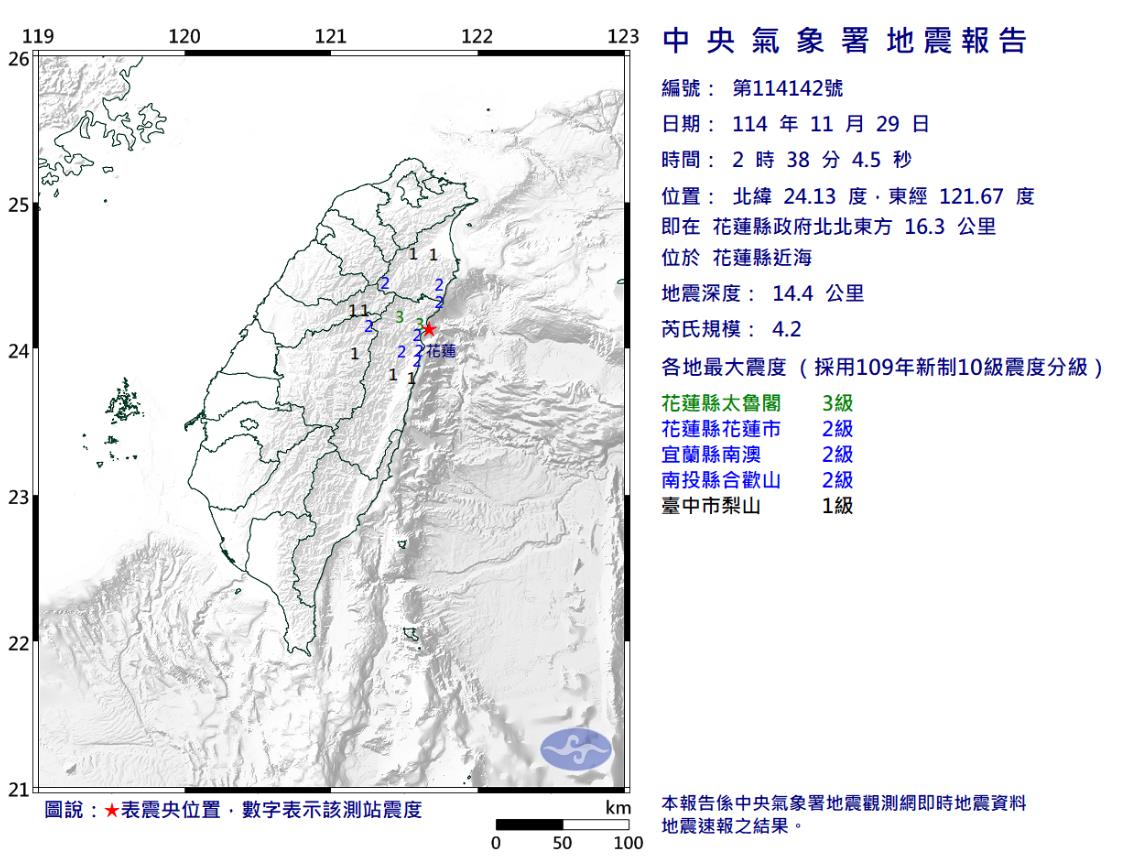 中央氣象署發布第142號顯著有感地震報告,今天凌晨2時38分,在花蓮縣政府北北東方16.3公里,位於花蓮縣近海,發生芮氏規模4.2地震,地震深度14.4公里。