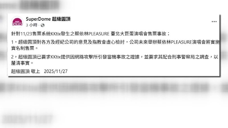 還有粉絲投訴已經操作到最後步驟,訂單成立卻顯示付款失敗,所有努力付諸流水的慘況,對此超級圓頂針對售票系統遭受網路攻擊一事,已經要求求KKTIX提出遭到網攻的具體證據,將會配合配合刑事警察局調查釐清事件真相。