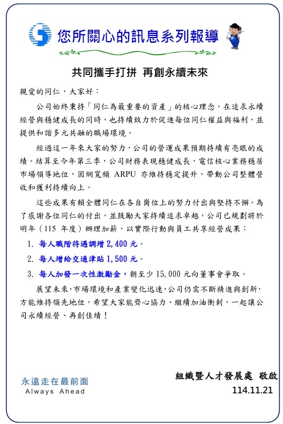 這些成果有賴全體同仁在各自崗位上的努力付出與堅持不懈。為了感謝各位同仁的付出,並鼓勵大家持續追求卓越,公司已規劃將於明年(115年度)辦理加薪,以實際行動與員工共享經營成果: