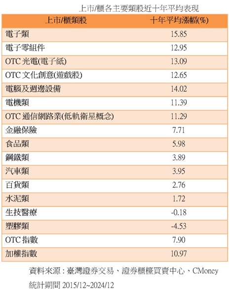 台股近月受AI疑慮消息面影響,反倒凸顯其它類股投資價值,據證交所、櫃買中心統計主要類股近十年平均表現(統計期間2015年12月~2024年12月),發現低軌衛星、遊戲以及電子紙族群對應類股,十年平均表現分別為11.29%、12.65%及13.09%,均優於加權指數漲幅僅10.97%,提供投資人AI族群以外的台股配置不錯選擇。