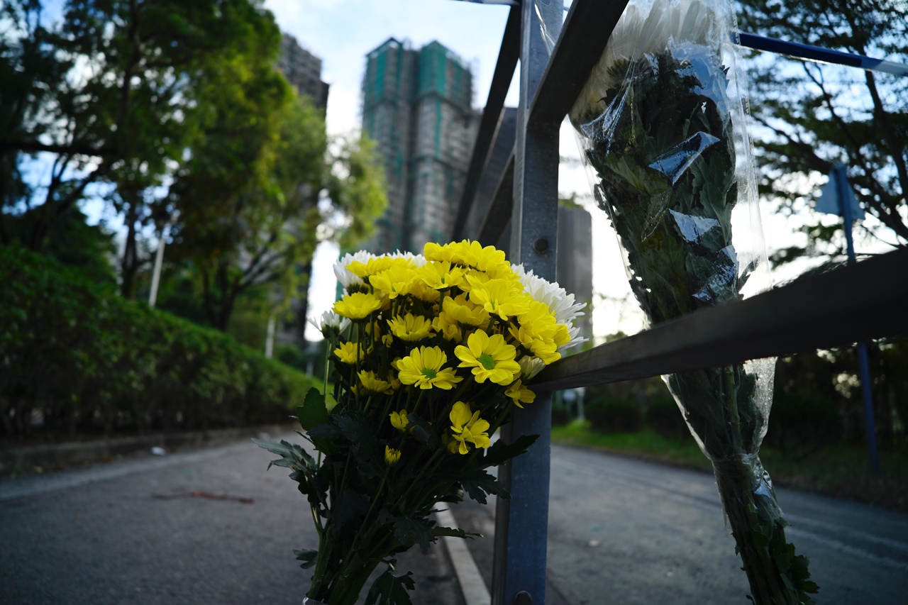 圖為29日清晨,火災後的大埔宏福苑樓宇附近拍攝的市民寄託哀思的花束。新華社