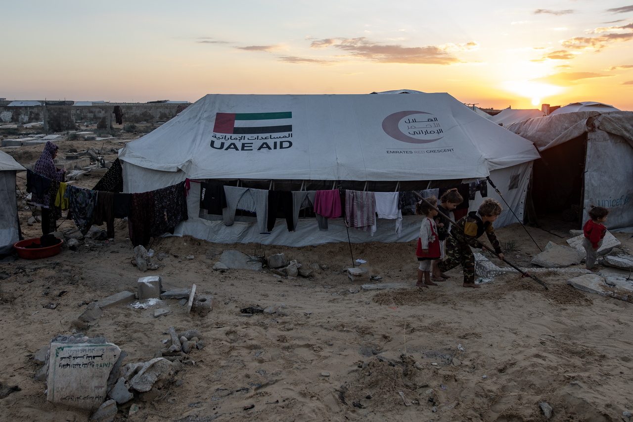 以哈戰爭長達兩年,造成加薩地區多數的巴勒斯坦人流離失所。圖為在加薩南部的汗尤尼斯一處墓園內,許多家庭被迫居棲身墓地。(歐新社) 歐洲新聞圖片社