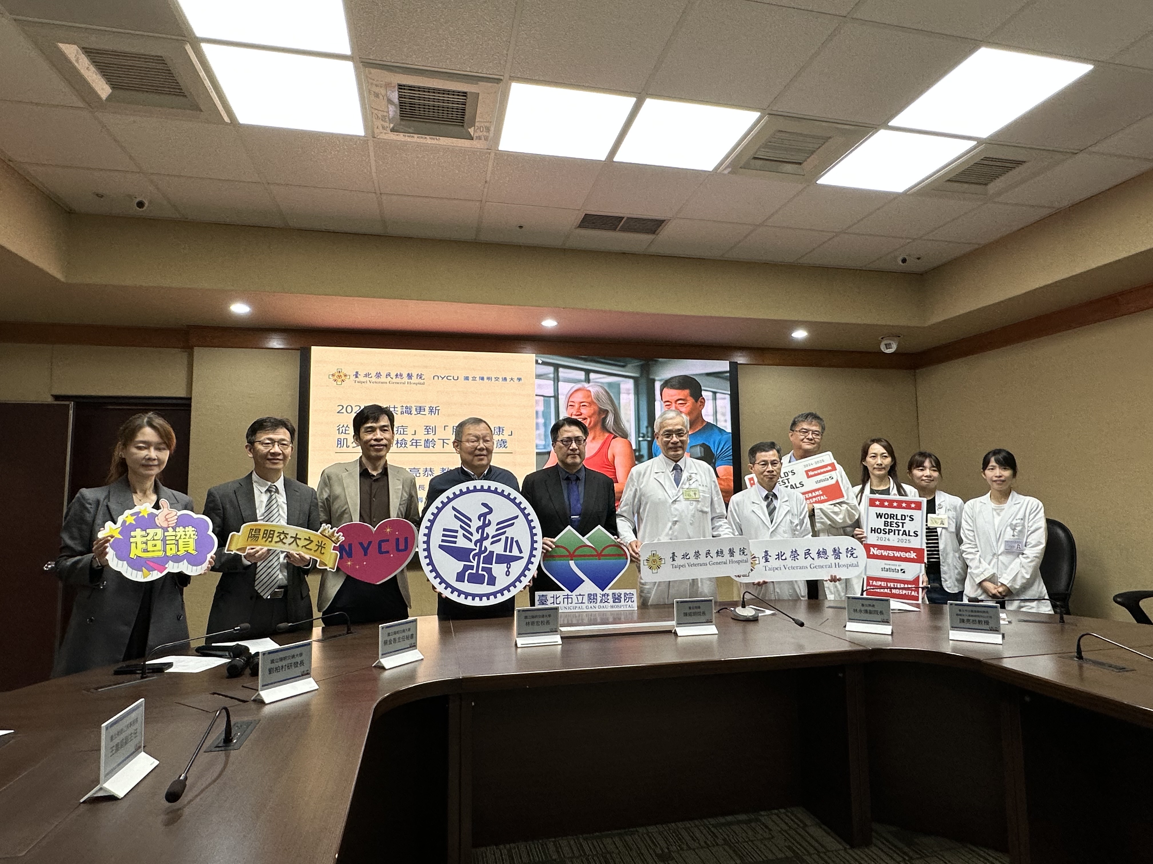 台北榮總與陽明交通大學共同合作致力於肌少症亞洲版診斷共識研究,北榮院長陳威明(右六)、陽明交通大學校長林奇宏(左四)、台北市立關渡醫院院長陳亮恭(左五),共同參與成果發表會。記者沈能元/攝影