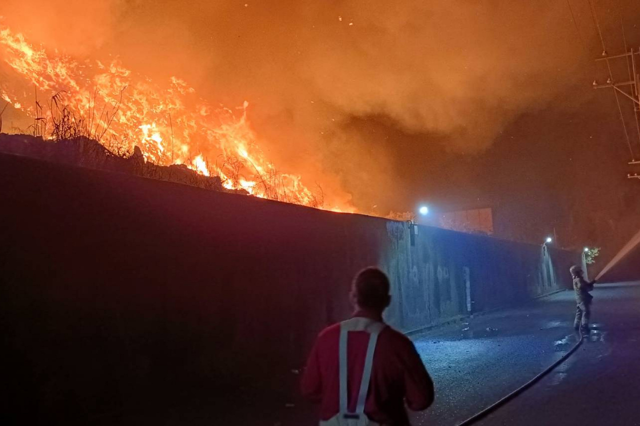 台南市安南區城西焚化爐附近的第三掩埋場30日晚間起火燃燒,消防局動員灌救,並通知環保局研擬是否發布空污警報。圖/讀者提供(中央社)