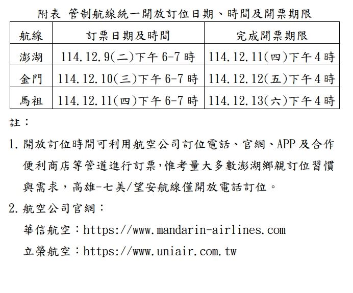 澎湖、金門及馬祖管制航線航班將分別於12月9日、10日及11日下午6時到7時開放受理旅客電話訂位及網路訂位購票,若透過航空公司網站購買離島返本島機票亦可免除5%營業稅。民航局表示,春節假期仍以航空旅運需求較大的澎湖、金門及馬祖等離島航線為疏運重點,各航空公司均已規劃加開班機及放大機型因應需求,並統一納入訂位管制,後續亦將視訂位狀況規劃第二波加班機。為儘早掌握旅客訂位情形及加速清艙作業,以利規劃後續加班機運能,提醒旅客於統一訂位時間所訂之機位應於訂位日起(含訂位當日)3日內完成開票。由於今年春節連續假期,民航局發現仍有旅客訂位未搭乘現象,因春節期間機票為寶貴資源,民航局提醒,此次春節假期,於尖峰時段2月13日至2月18日台灣出發往離島方向,及2月18日至2月23日離島出發回台灣方向之機票,均會加註「限當日當班次有效」及「逾期作廢」之使用限制,使有限之空運資源獲得更有效之利用。退票期限規定亦為「最遲於航班起飛前辦理退票」,如因故無法搭乘原訂航班時,務必於航班起飛前通知航空公司取消訂位。民航局表示,春節期間尖峰日期及時段之航班需求大,惟依往年經驗,離峰航班多仍有空位,為省除民眾訂位及等待候補機位之時間與辛勞,建議民眾於無法取得首選航班機位時,可考慮其他次佳日期或離峰時段優惠機票航班。此外,建議居住本島之家人可安排離島鄉親來臺團圓,除可免去訂位困擾外,亦可避開擁擠人潮。