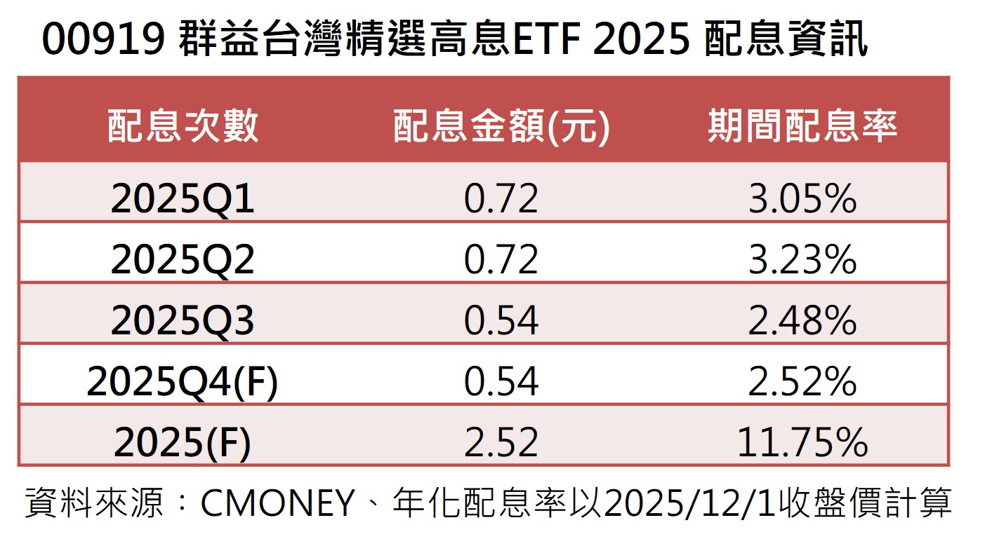 00919群益台灣精選高息ETF配息資訊。(資料來源:CMONEY、年化配息率以2025/12/1收盤價計算)
