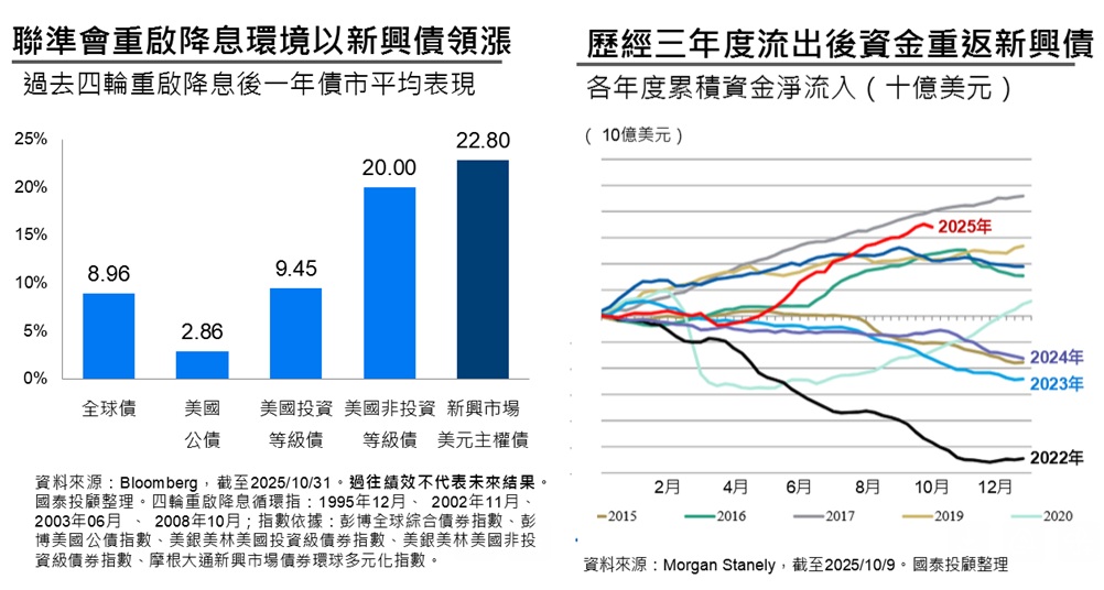 最後,資金流加緊腳步重返新興債資產。根據全球EPFR資金流向,新興市場債資金流經歷2022、2023及2024年過去三年資金流出此資產後,終於在2025年再度重返,今年以來新興市場債資金淨流入由負翻正;國泰投顧進一步研究認為,過往升息緊縮週期下,全球資金流向新興市場債資產配置通常較為清淡,隨著聯準會政策轉向,資金可望重新流入。此外,從資金流向研究另一個角度來看,今年以來新興市場債累積資金流入為2019年以來最大幅度流入,尤其第4季以來新興市場債資金正在加速流入,對新興市場債資產表現帶來推波助瀾。