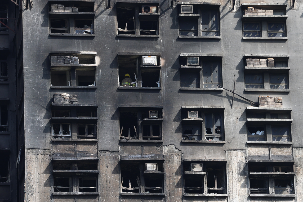 焚燒逾43小時的香港宏福苑大火被撲滅後,香港警方的災難遇害者辨認組、鑑證科等人員已開始進入災場內搜索遺體及相關證據。據香港警方發出的多張相片,大廈內滿目瘡痍,全屋被燒光,只剩下黑色的灰燼,一片頹垣敗瓦。