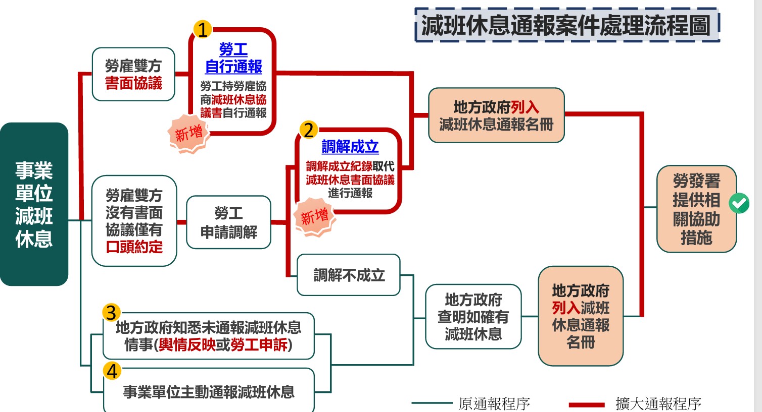為了避免事業單位進行減班休息未及時通報,造成政府無法及時協助勞工,勞動部與地方政府合作,擴大通報減班休息對象及管道。持有減班休息書面協議書之勞工,可自行向地方政府通報。