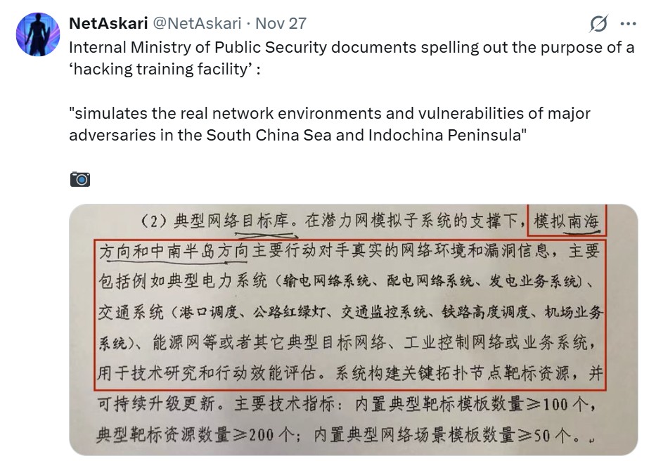 國際資安研究員NetAskari最近在自己的X、部落格之中,陸續貼文,公布了中國大陸政府內部的數位訓練場細節,這個訓練場就有如數位靶場一般,建置目標主要是在訓練國家級駭客,如何攻擊「主要對手」的關鍵基礎設施。