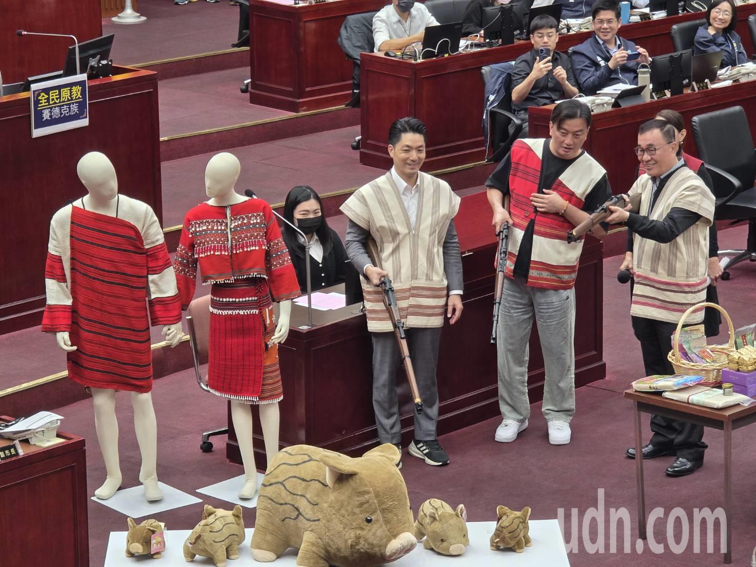 原住民議員李傅中武針對原住民可否持有獵槍質詢台北市長蔣萬安,並準備了玩具獵槍和山豬道具,在議場「開槍」射擊獵山豬。記者楊正海/攝影