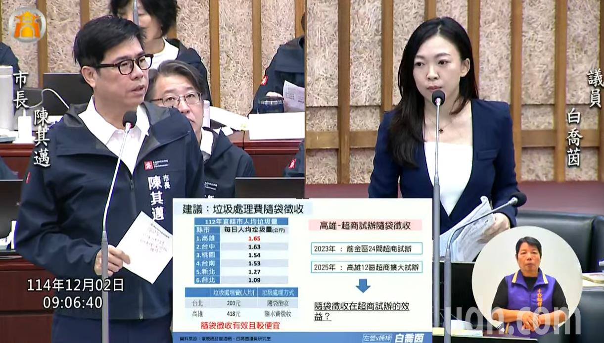 高雄每天人均垃圾產量1.65公斤、六都第一,垃圾隨袋徵收制度超商試辦多年未擴及全市。高市議員白喬茵指出,隨水費增收費用比隨袋徵收的北市多出1倍,超商試辦隨袋徵收是虛晃一招,多剝一層皮。市長陳其邁表示,他支持擴大試辦,可研議在整個行政區試辦。