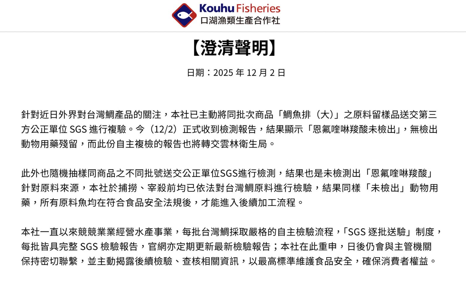 針對全聯販售的「台灣鯛魚排(大)」日前遭高雄市衛生局檢出動物用藥殘留一事,供貨源頭雲林縣口湖漁類生產合作社12月2日於官網發出澄清聲明,內容指出,經主動將同批次留樣產品送交第三方公正單位SGS進行複驗,結果確認為「未檢出」,與衛生局抽驗結果出現落差,目前已將相關報告轉交雲林縣衛生局釐清。