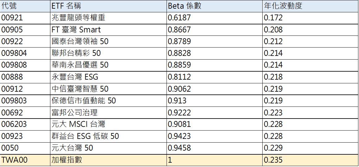 根據統計,台股加權指數近一個月的年化波動度為0.235,但市場上包括兆豐龍頭等權重(00921)、FT臺灣Smart(00905)、國泰台灣領袖50(00922)、聯邦台精彩50(009804)以及華南永昌台灣優選50在內的多檔 ETF,其年化波動度皆低於此水準,Beta係數也都低於大盤。凸顯其系統性風險和價格震幅皆低於市場平均,為投資人在波動環境下提供了一層風險緩衝保護。