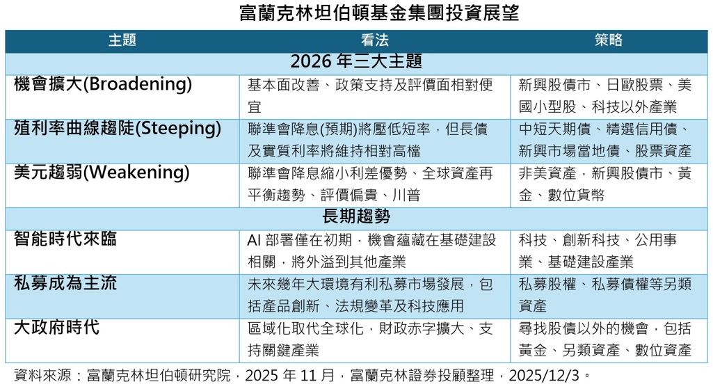 富蘭克林坦伯頓基金集團2026年看好三大主題,包括: