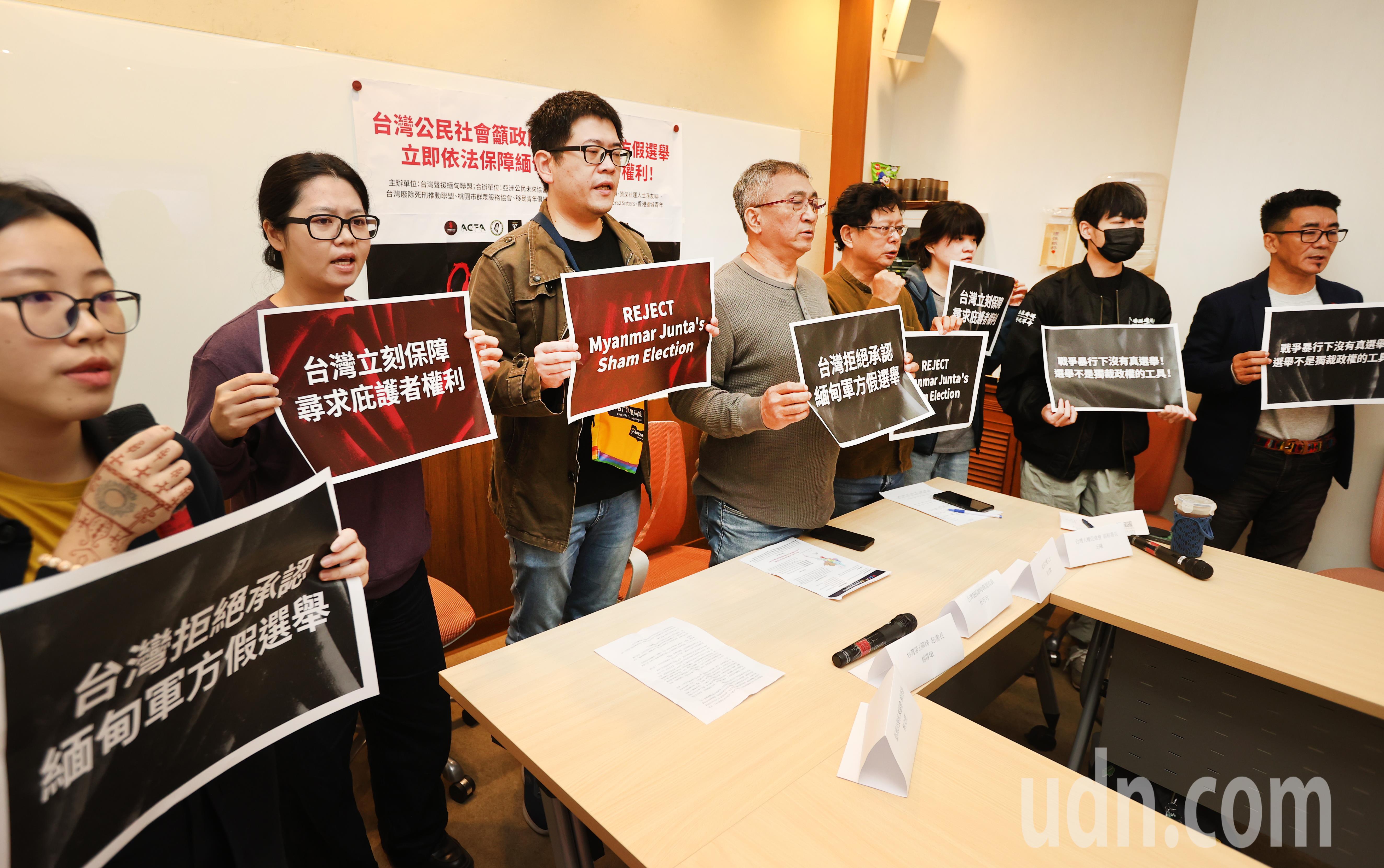 台灣聲援緬甸聯盟、Sisters2Sisters、亞洲公民未來協會、台灣人權促進會等多個公民人權團體上午在立法院舉行記者會表示,緬甸軍政府大選在即,特地舉行記者會呼籲台灣政府應拒絕承認大選結果,並能夠依法保障來台尋求庇護的緬甸人民權利,展現人權立國的自由民主價值。