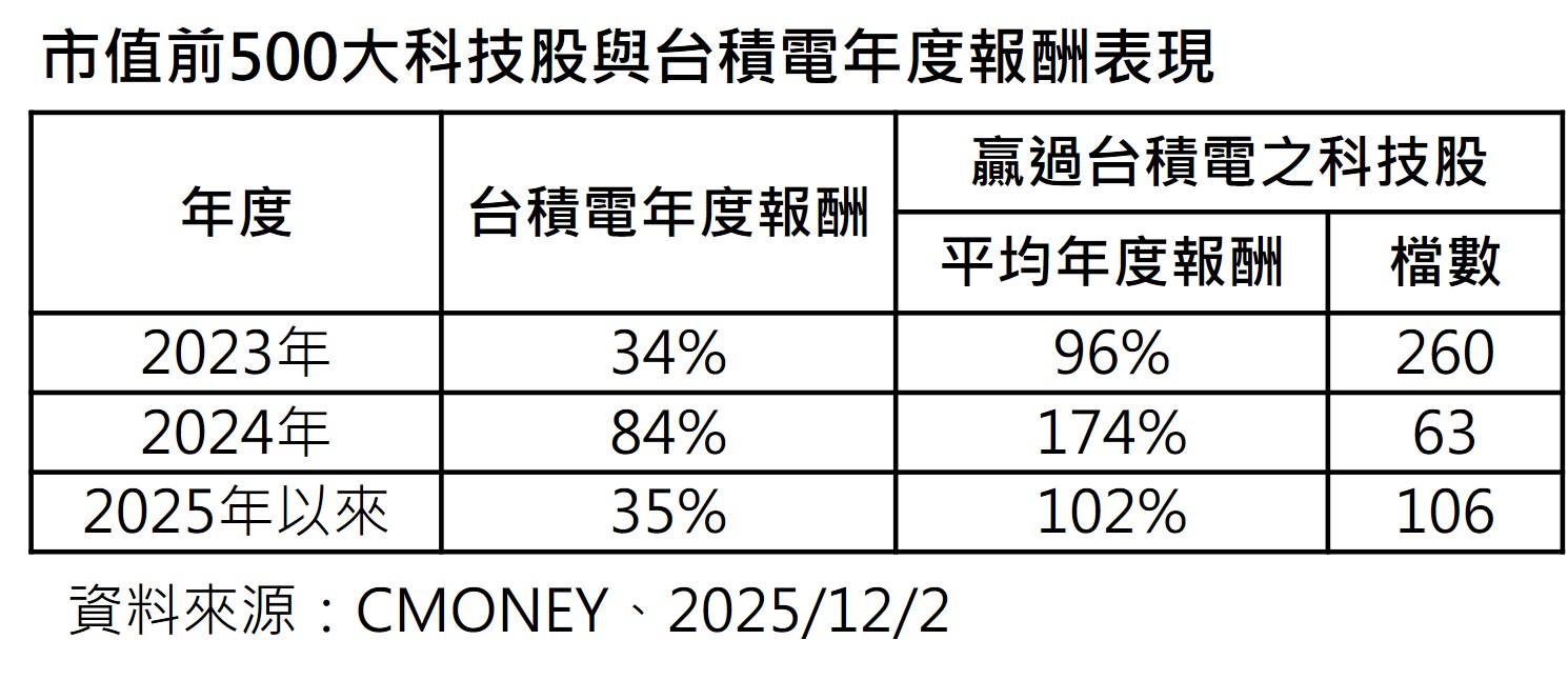 市值前500大科技股與台積電年度報酬表現。(資料來源:CMONEY、2025/12/2)