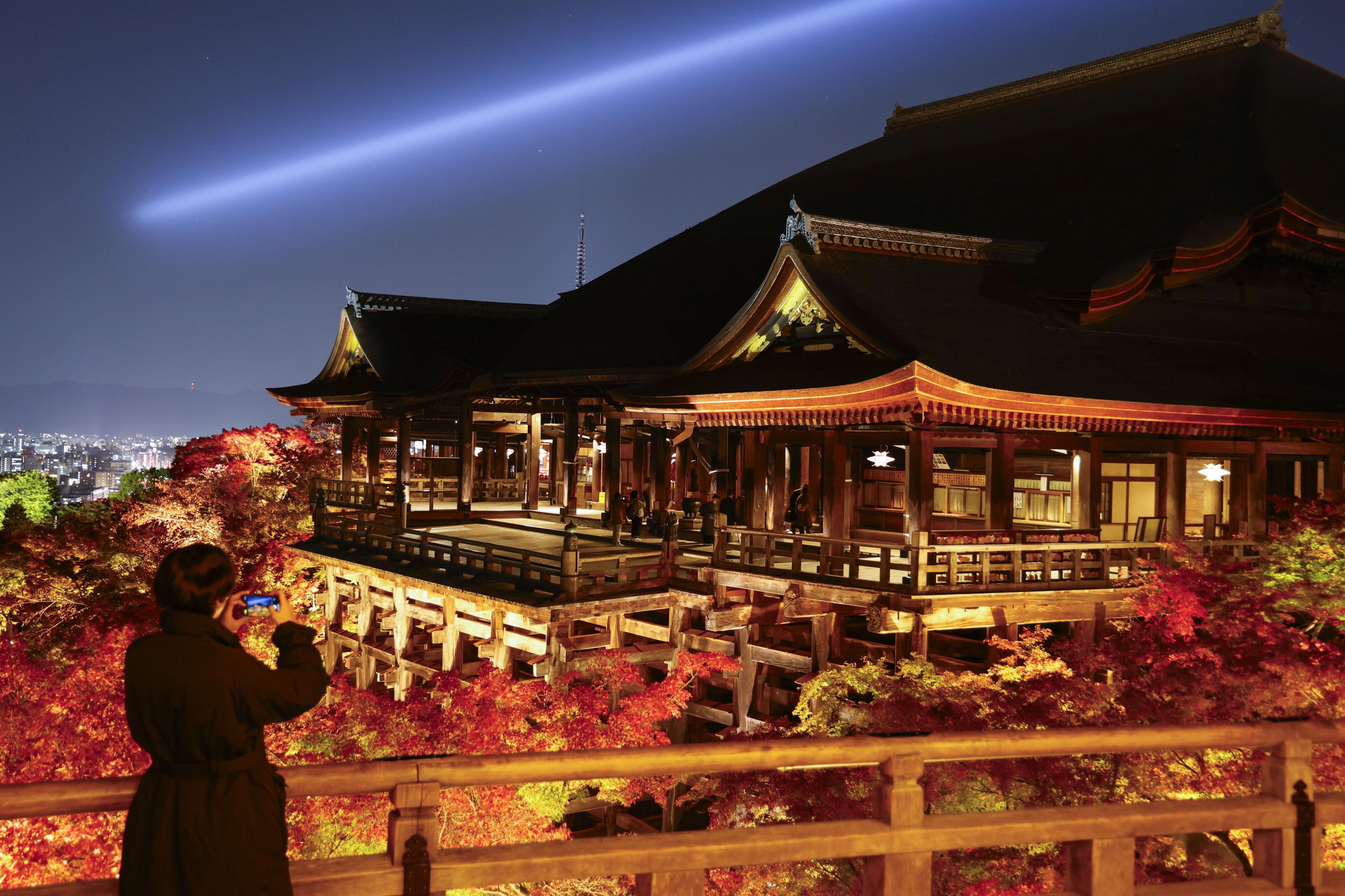 日經亞洲報導,日相高市「台灣有事」答辯爭議已衝擊日本觀光業。圖為日本京都清水寺11月21日舉行例行秋季夜間特別參拜揭幕前的試亮燈。路透