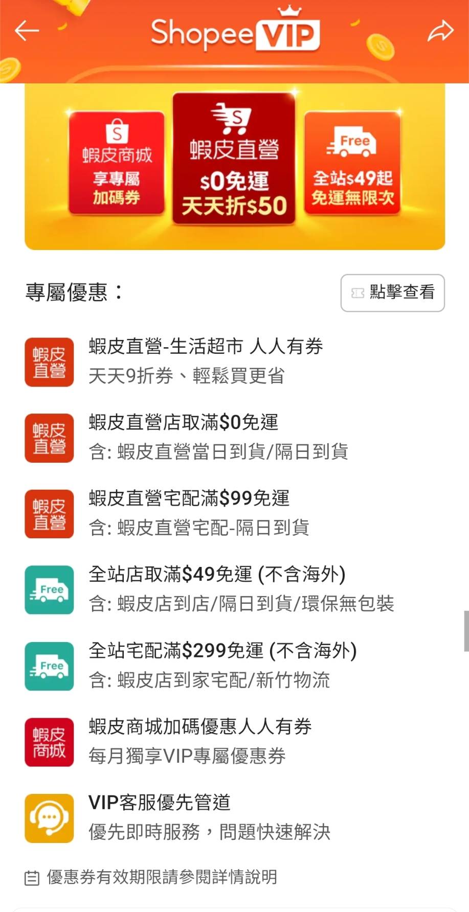 蝦皮購物再度針對購物優惠推「蝦皮VIP」,月費59元。圖/取自蝦皮購物App
