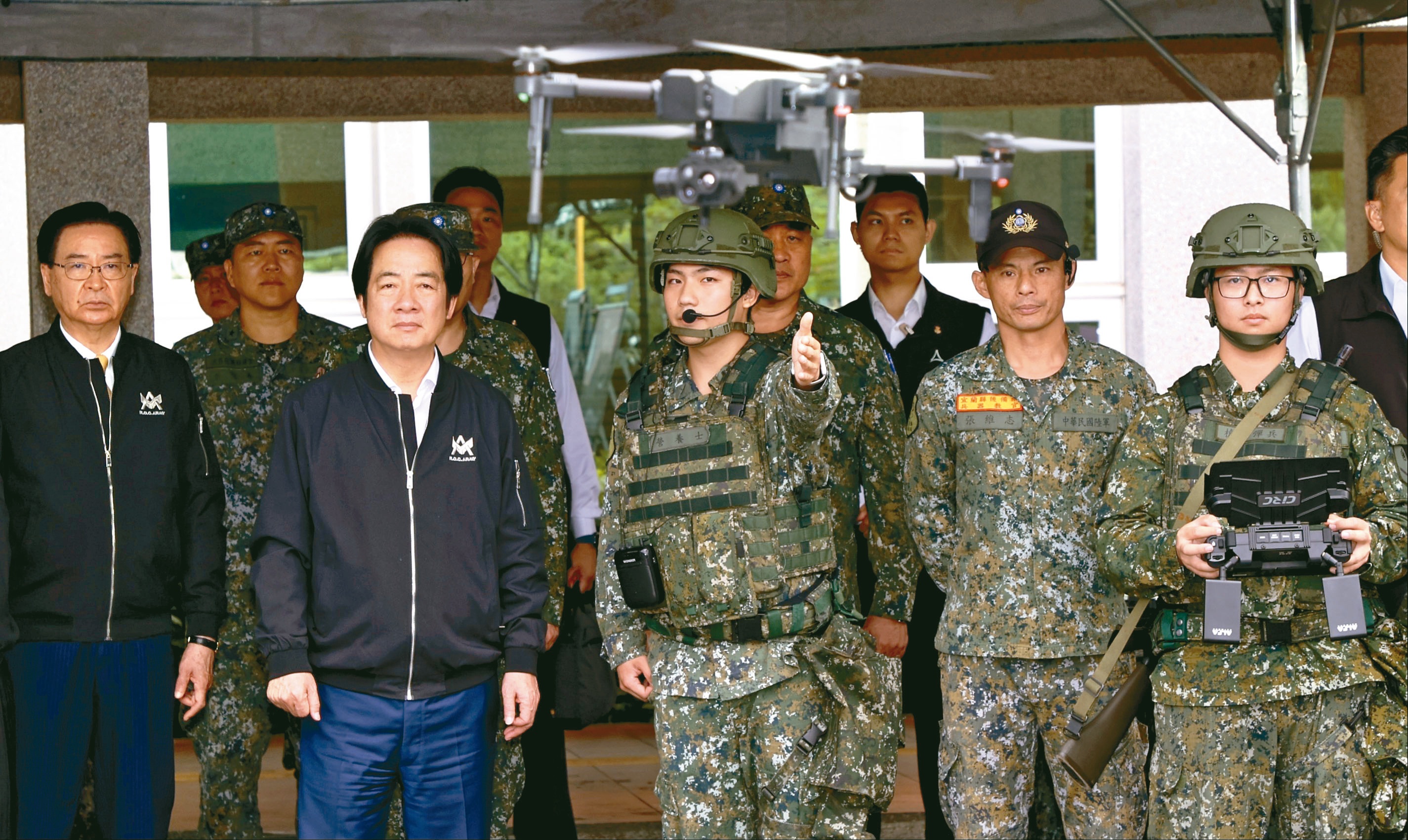 推動國防特別預算,賴清德總統(前左二)昨視察宜蘭後備旅步三營教召訓練,了解無人機操作。圖/聯合報系資料照片