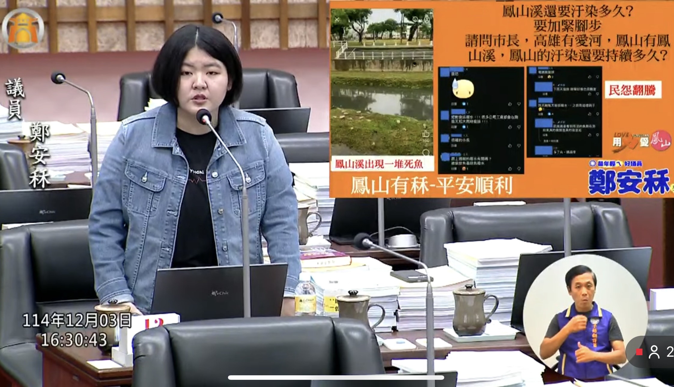 市議員鄭安秝要求加快鳳山區汙水下水道接管速度,改善鳳山溪水質汙染惡化問題。圖/翻攝自高雄市議會官網