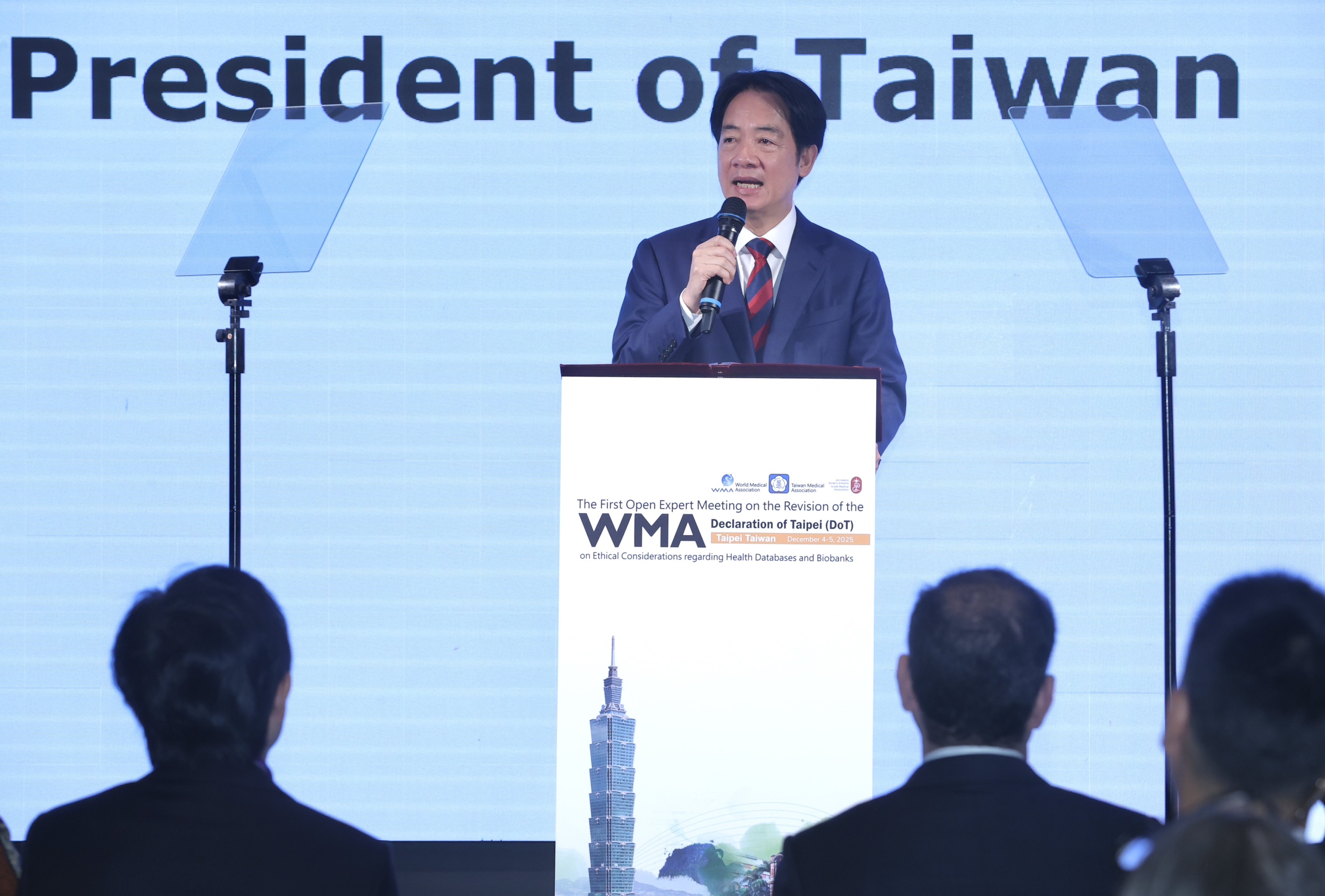 世界醫師會(WMA)首次「台北宣言」(Declaration of Taipei)修訂公開專家會議今起舉行,賴清德總統今出席致詞表示,目前AI運用,不論是在國際疫情監測、健康存摺、在宅醫療、或是遠距醫療、科技輔具、家醫大平台等方面,都已展現初步成果。明年「國家感染性疾病資源庫」完工後,更將促進台灣與各國生技領域的合作交流。