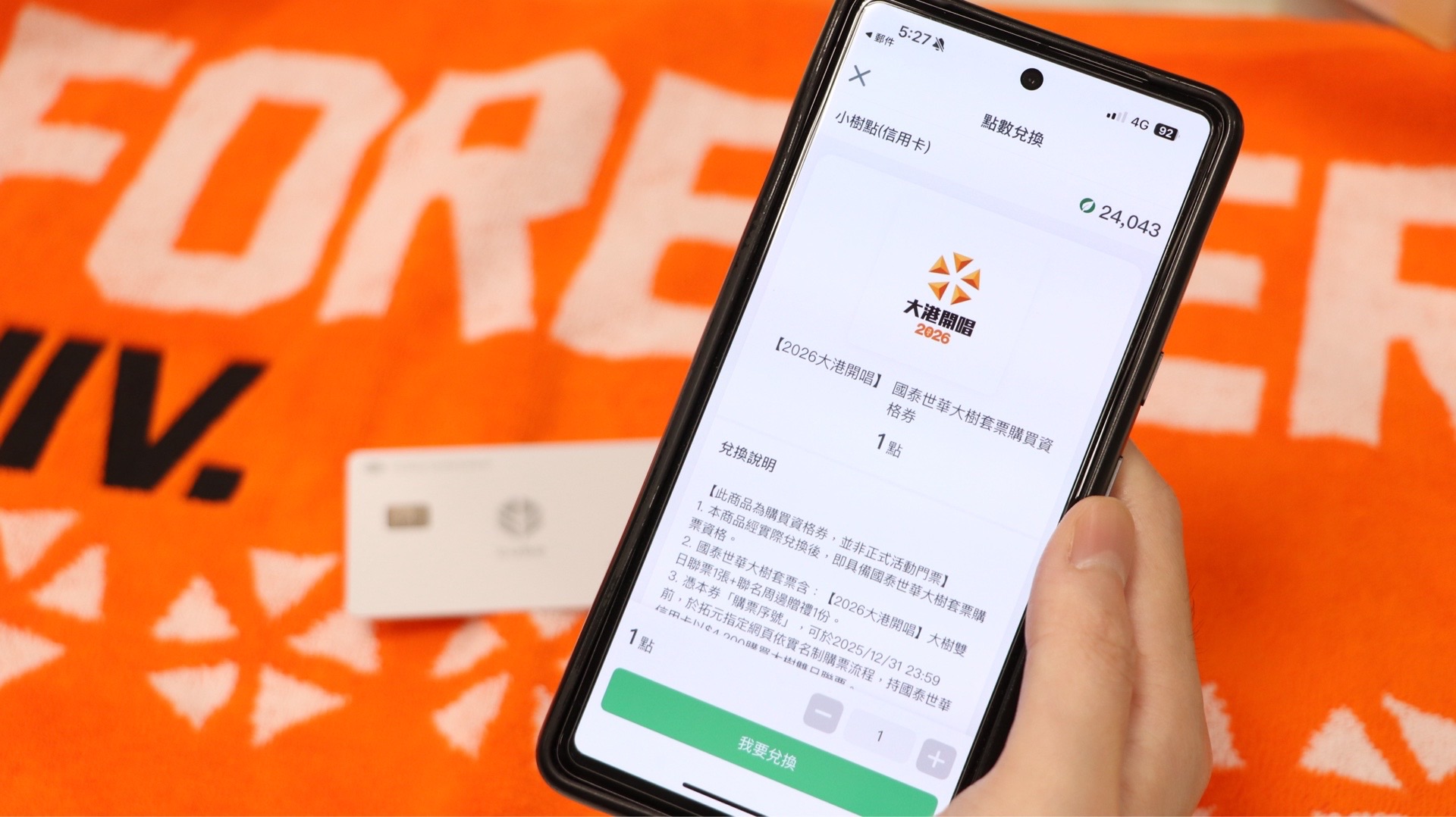 此外,國泰世華也同步提供小樹點(信用卡)兌換購票序號服務。自12月16日下午3點起,持卡人可於國泰優惠App以1點小樹點(信用卡)兌換專屬購票序號,每人最多可換2組,取得序號後即可前往拓元指定頁面,以國泰世華信用卡購買「國泰世華大樹套票」,套票內容包含大樹雙日聯票1張與限定聯名周邊。