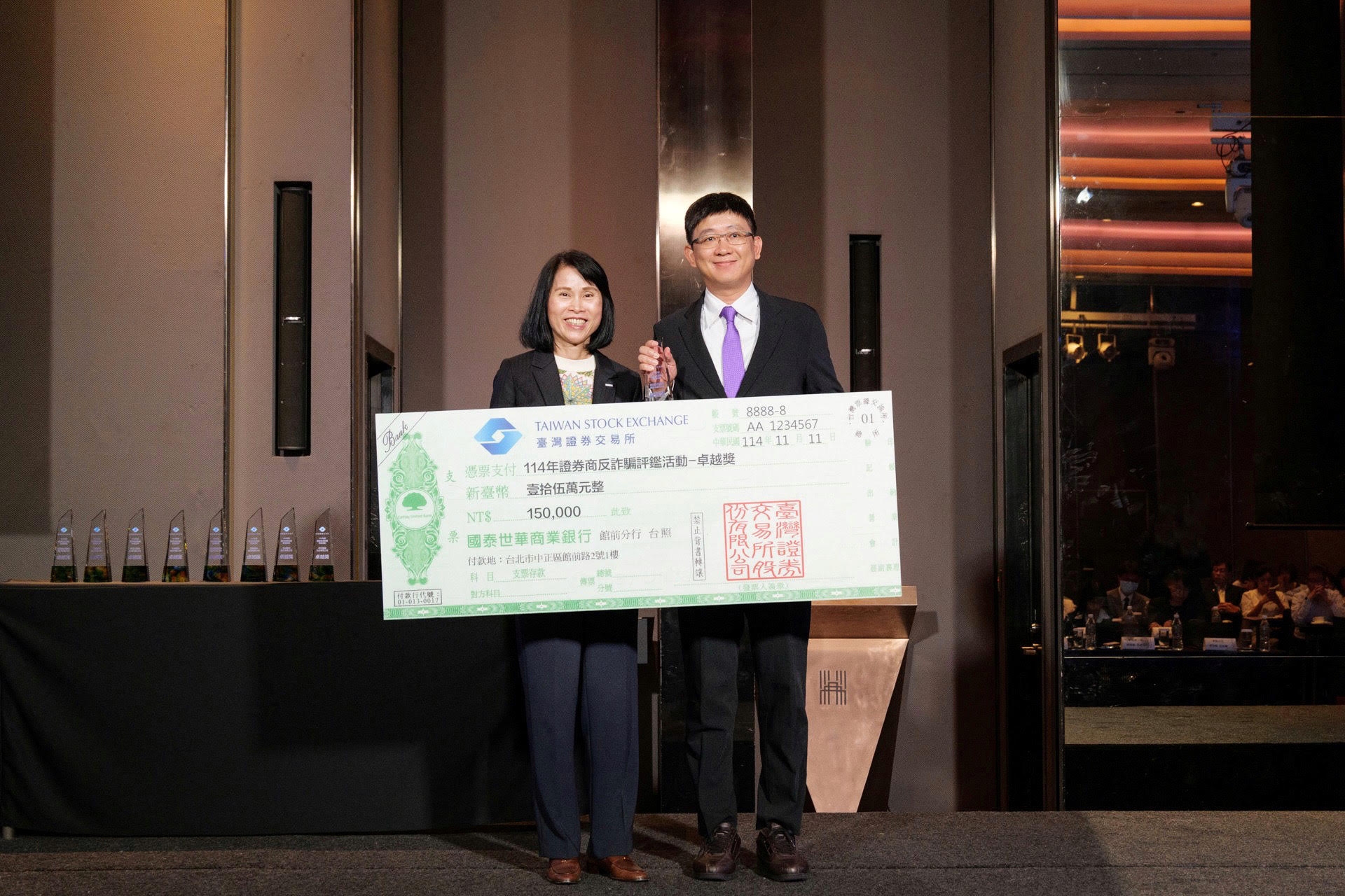 國泰證券秉持「防詐、阻詐、識詐」三大方針,全方位強化金融安全防護,於今(2025)年度臺灣證交所反詐評鑑再獲「卓越獎」殊榮,由國泰證券副總經理呂錦棠代表出席領獎。國泰證券/提供