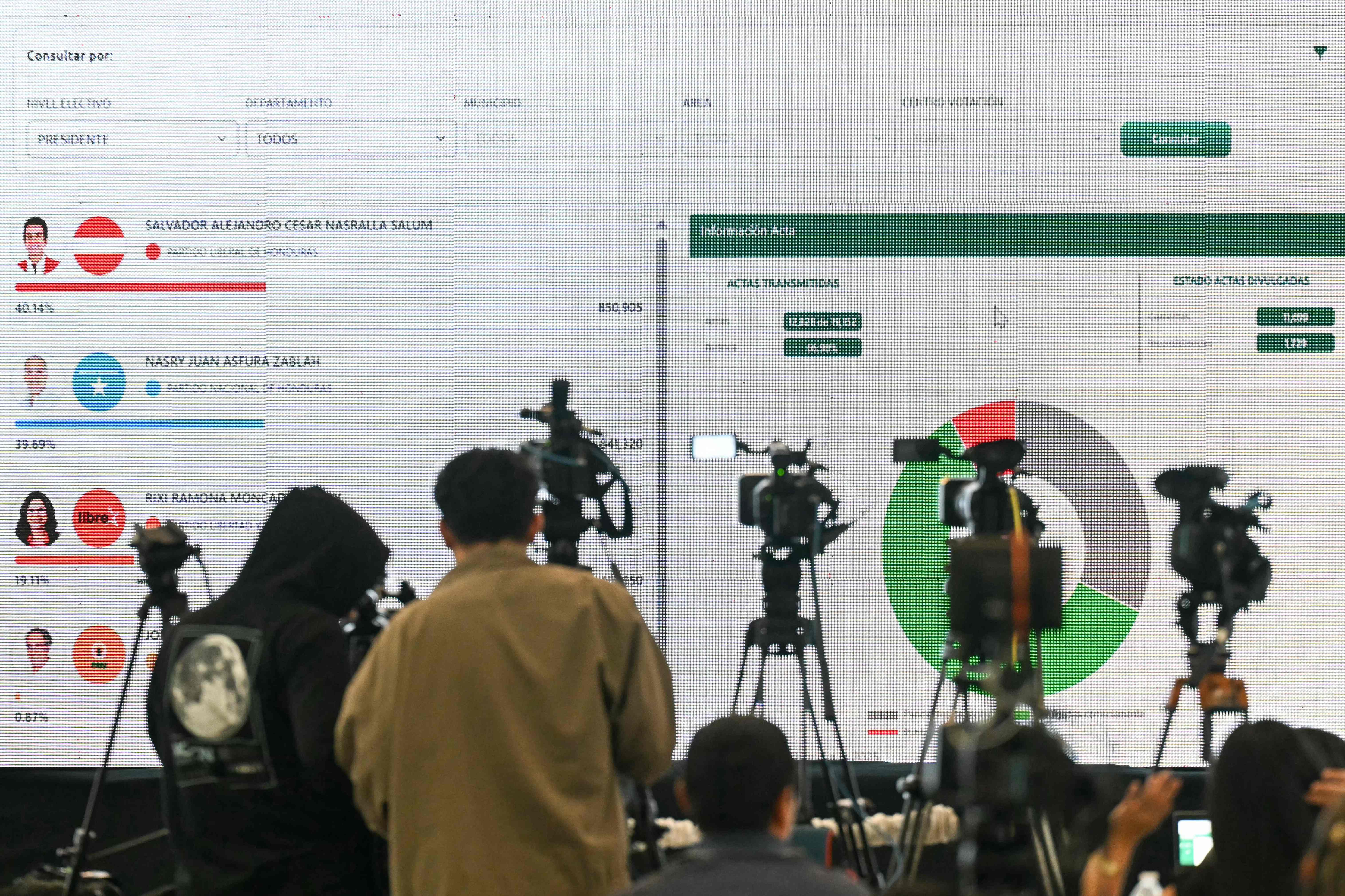 媒體記者2日在宏都拉斯首都德古西加巴的選委會開票中心關注開票進度。法新社