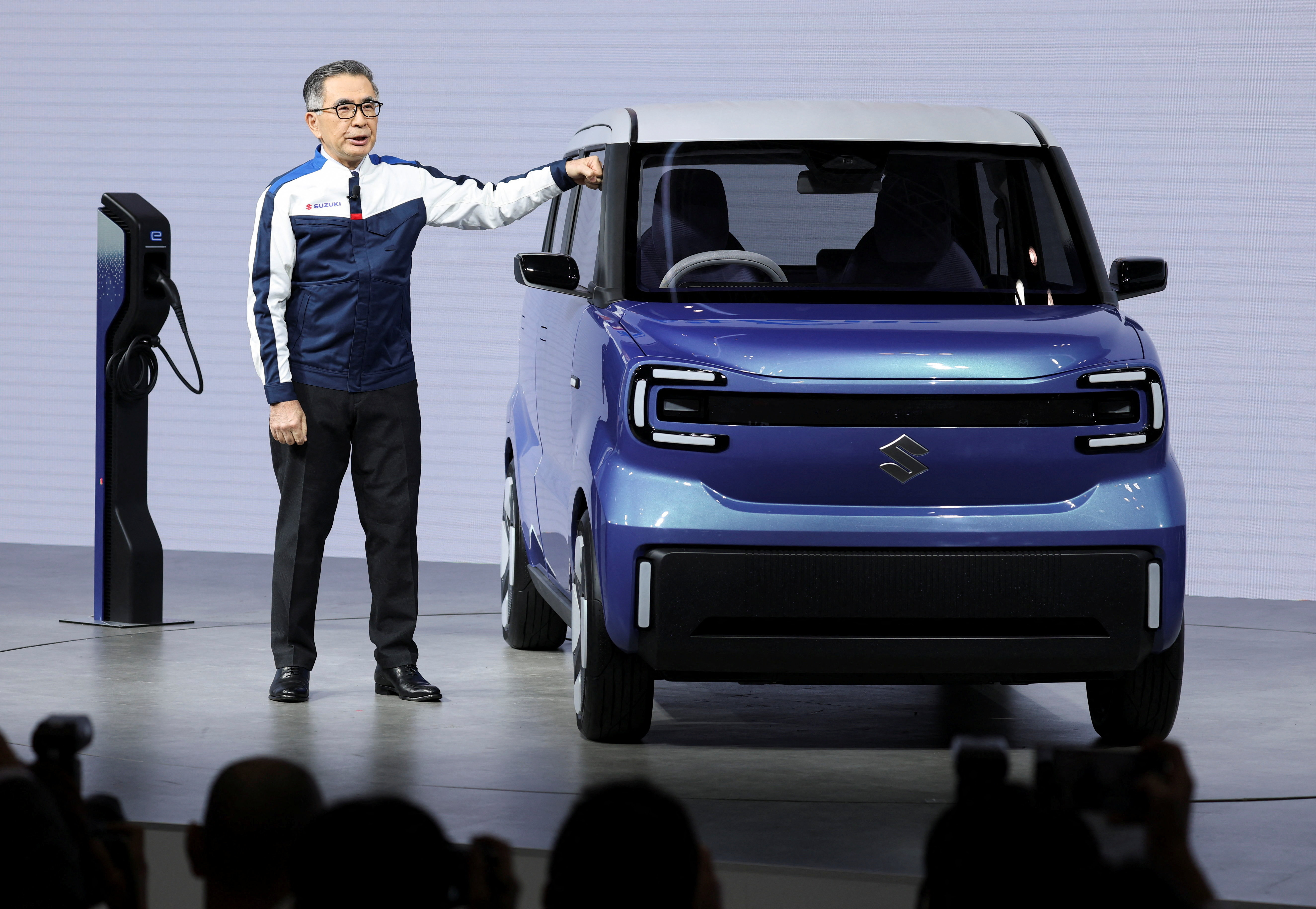 鈴木汽車總裁鈴木俊宏今年10月在東京「日本移動展」車展上,介紹公司首款輕型電動車Vision e-Sky概念車。 路透