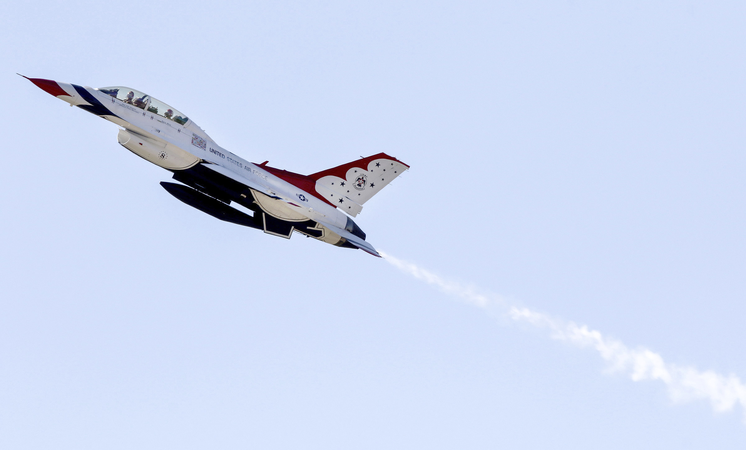 美國空軍「雷鳥」飛行表演隊的一架F-16「戰隼」戰機。資料照片。美聯社