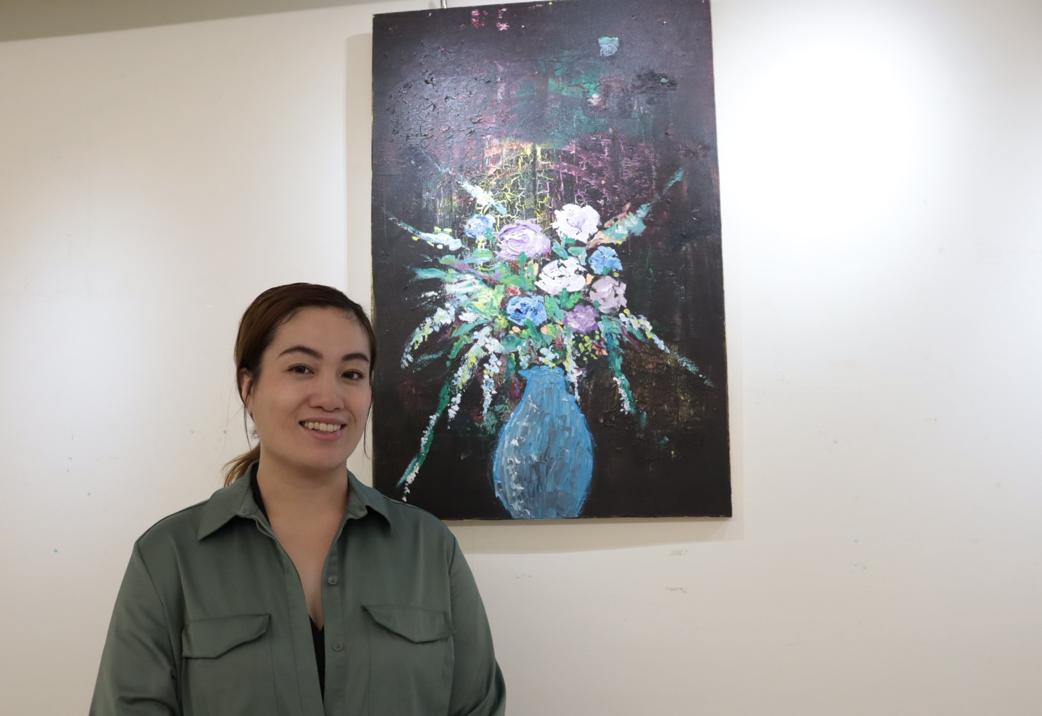 畫家兼美髮師陳怡君的畫作在衛福部彰化醫院藝術走廊展出。記者簡慧珍/攝影