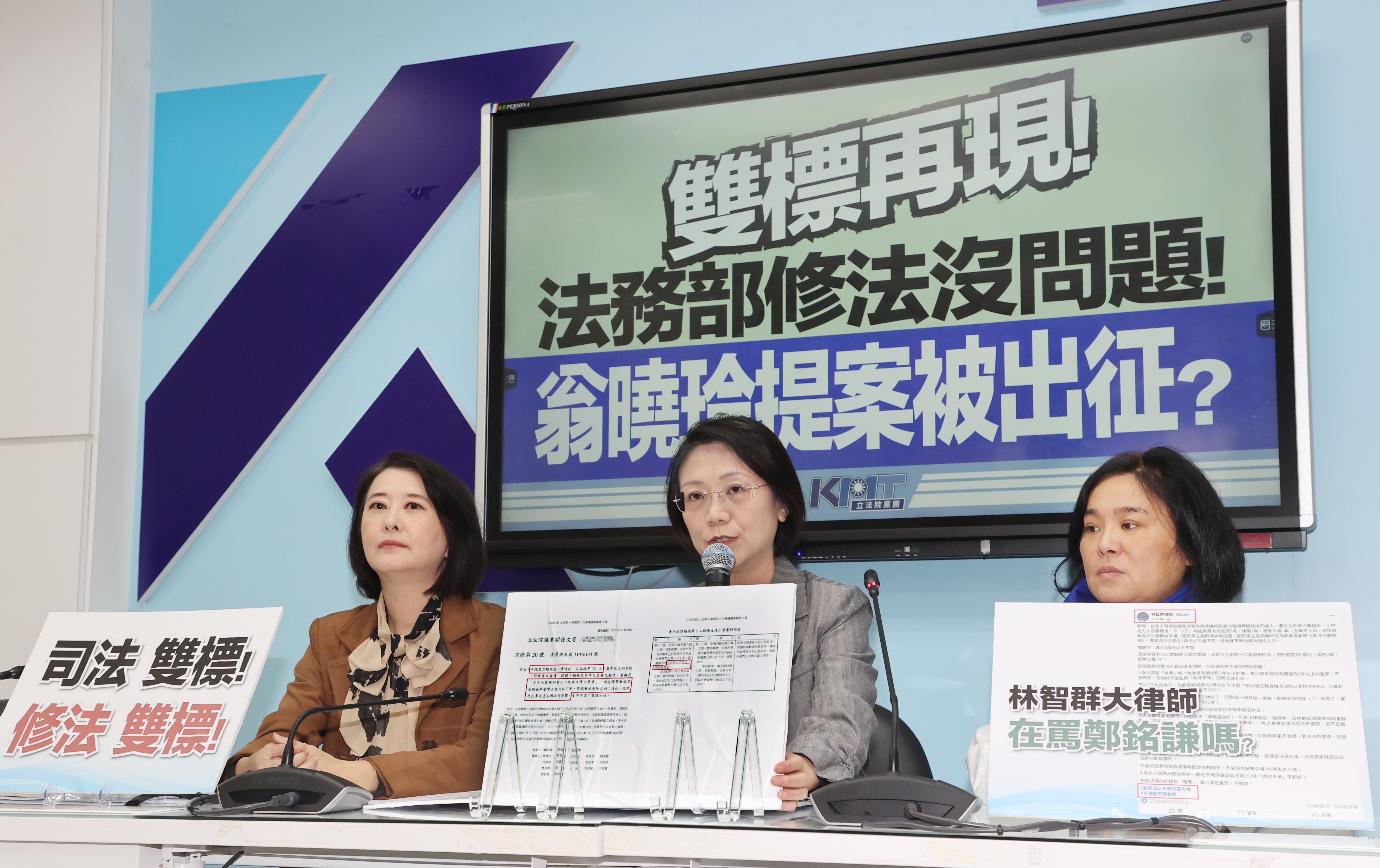 國民黨團副書記長陳玉珍(右)、立委王鴻薇(左)、翁曉玲(中)上午舉行「雙標再現!法務部修法没問題!翁曉玲提案被出征?」記者會,翁曉玲表示被「扣帽子」說要把貪汙治罪條例的這個貪汙罪除罪化,這根本就是造謠。記者曾學仁/攝影