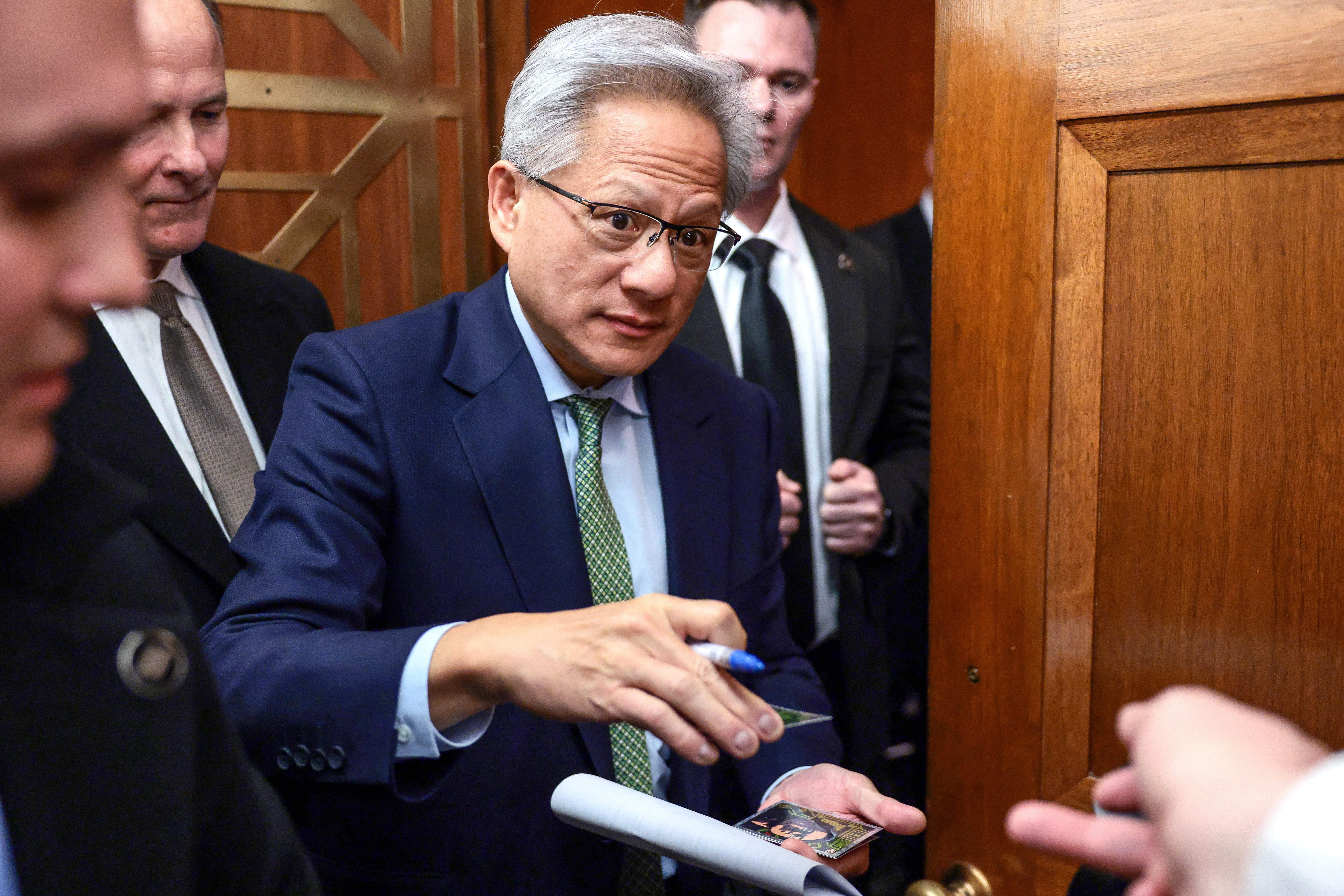 黃仁勳在眾議院議長強生辦公室外告訴記者,他此行是為了「回答有關AI的問題」。