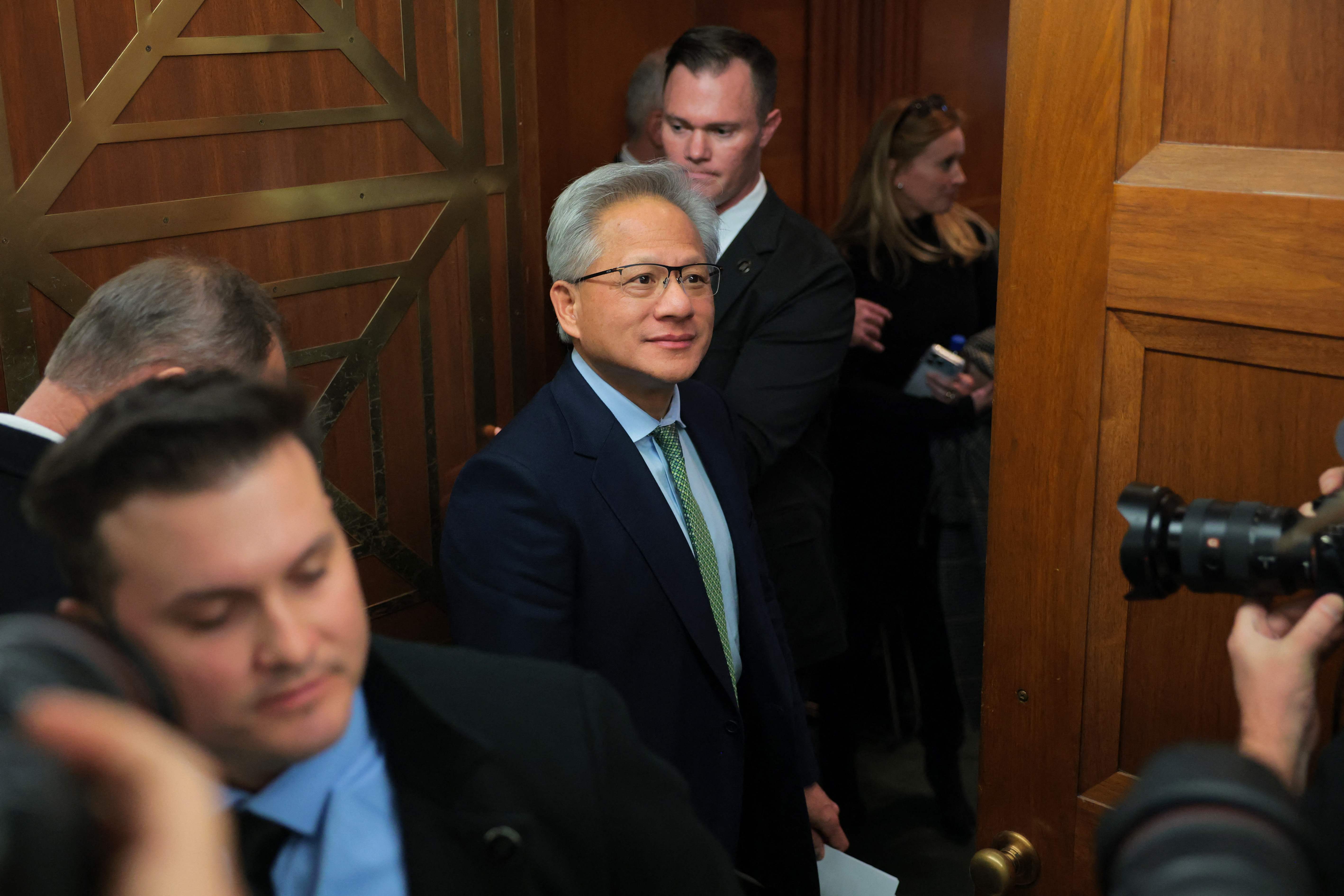 輝達執行長黃仁勳(中)3日前往華府國會山莊,準備與參議院銀行委員會會面時接受訪問。法新社