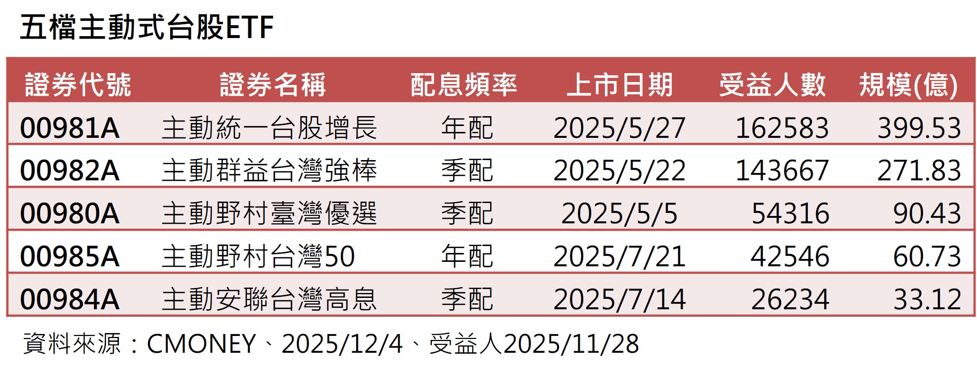 5檔主動式台股ETF。(資料來源:CMONEY、2025/12/4、受益人2025/11/28)