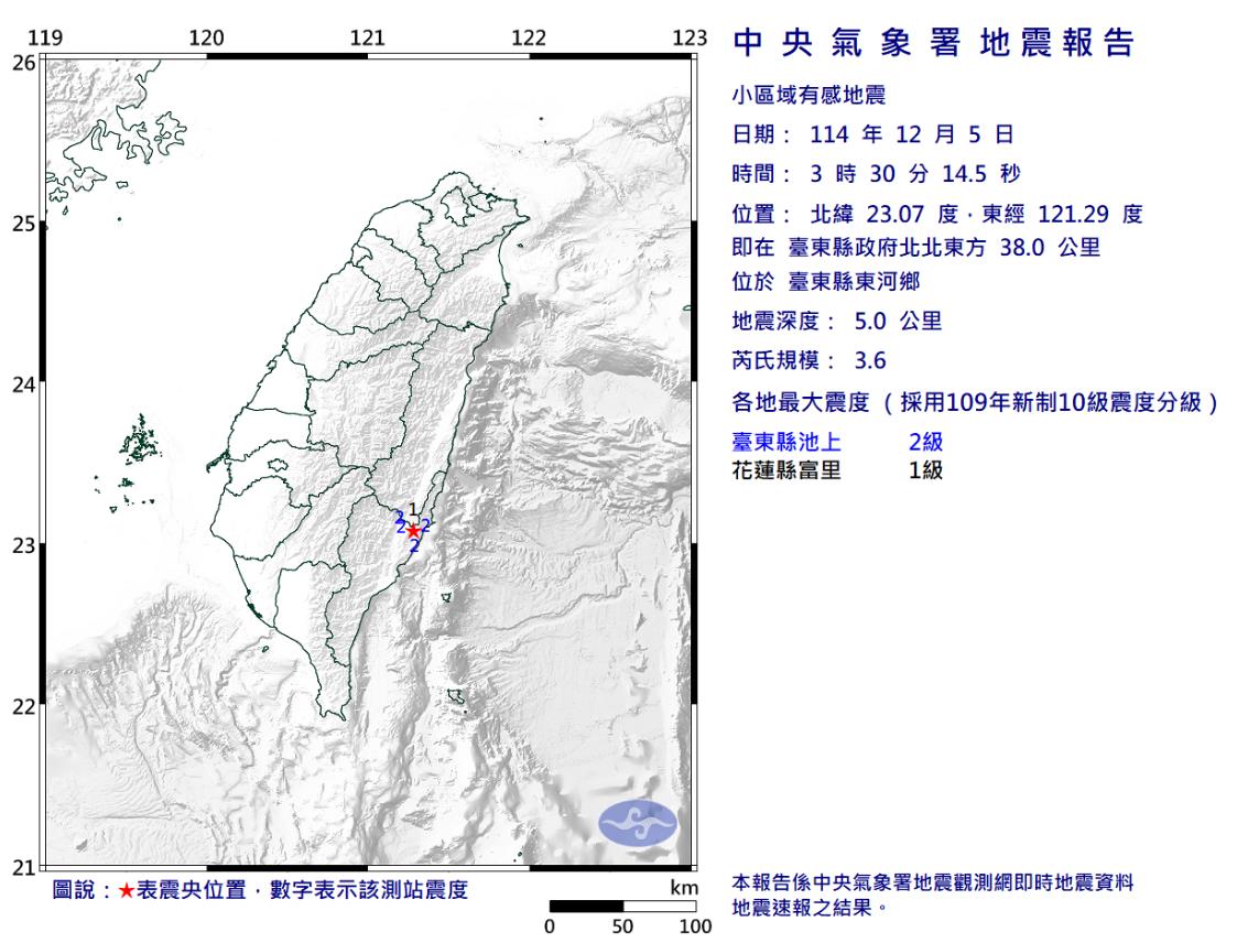 中央氣象署發布小區域有感地震報告,今天凌晨3時30分,在台東縣政府北北東方38.0公里,位於台東縣東河鄉,發生芮氏規模3.6地震,地震深度5公里。