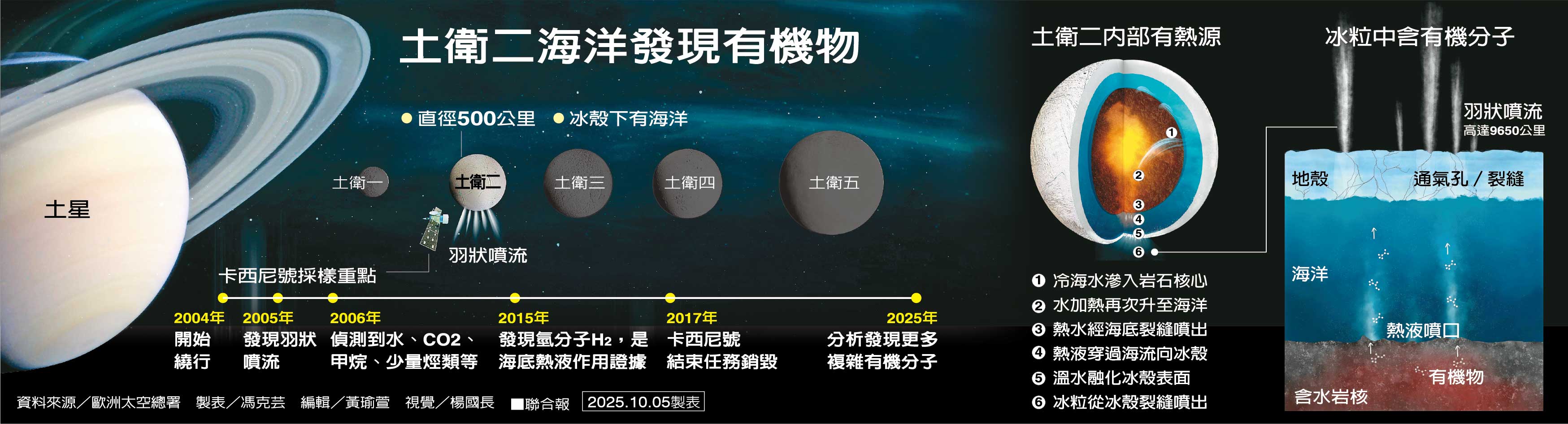 國際期刊《自然天文學》日前刊登科學家對土衛二(恩賽勒達斯)的新發現。藉由美國太空總署(NASA)太空探測船卡西尼號蒐集的資料數據,科學家認為,土衛二噴湧的水蒸氣羽流中,存在新型的複雜有機分子,可能孕育生命。