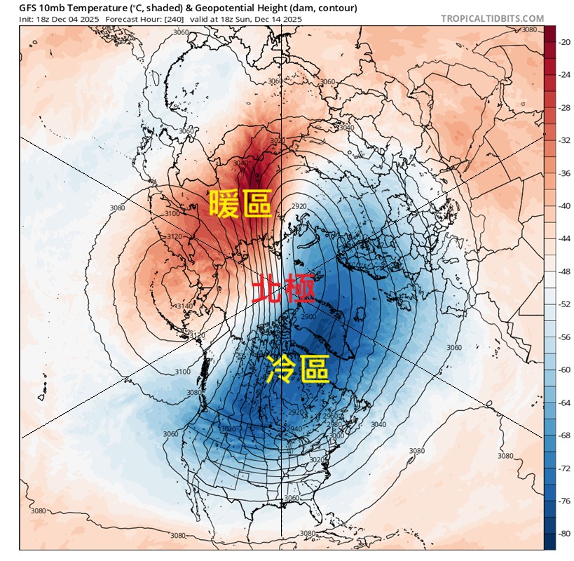 「變形的極渦」,鄭明典表示,在近地面的反應,北美兩側脊場逐漸增強,這本來就是氣候上常發生的現象,但是在統計上,平流層暖變發生之後,這兩個脊場常會更靠近也更持續,結果是北美的分裂極渦陷在兩脊場內持續影響北美洲,很容易為美國東北部帶來持續的冬季風暴影響,偶爾冷空氣甚至可達佛羅里達州。