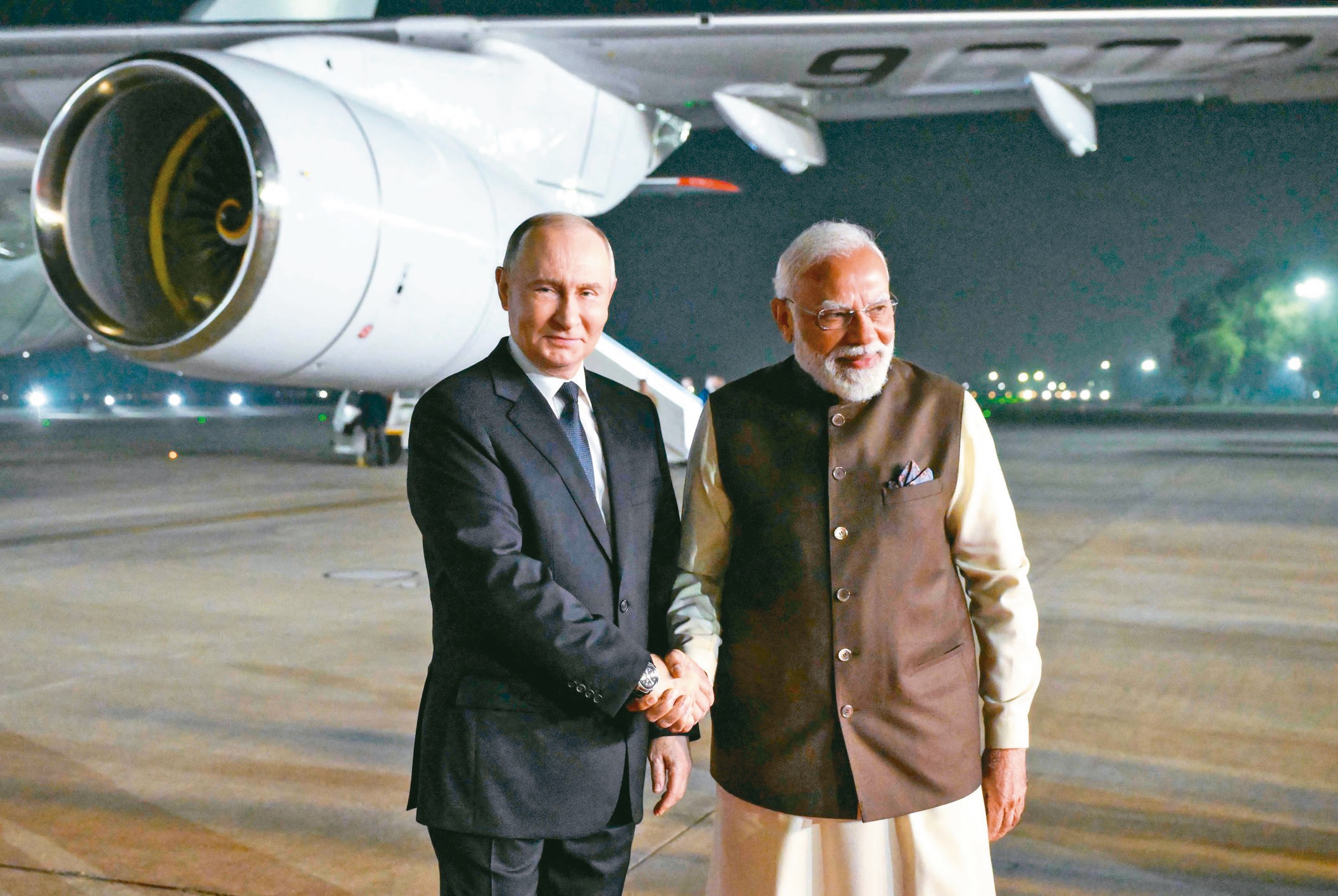 俄國總統普亭(左)四日抵達新德里訪問,印度總理莫迪(右)親自在機場迎接,兩人並同成一部車離去。(法新社)
