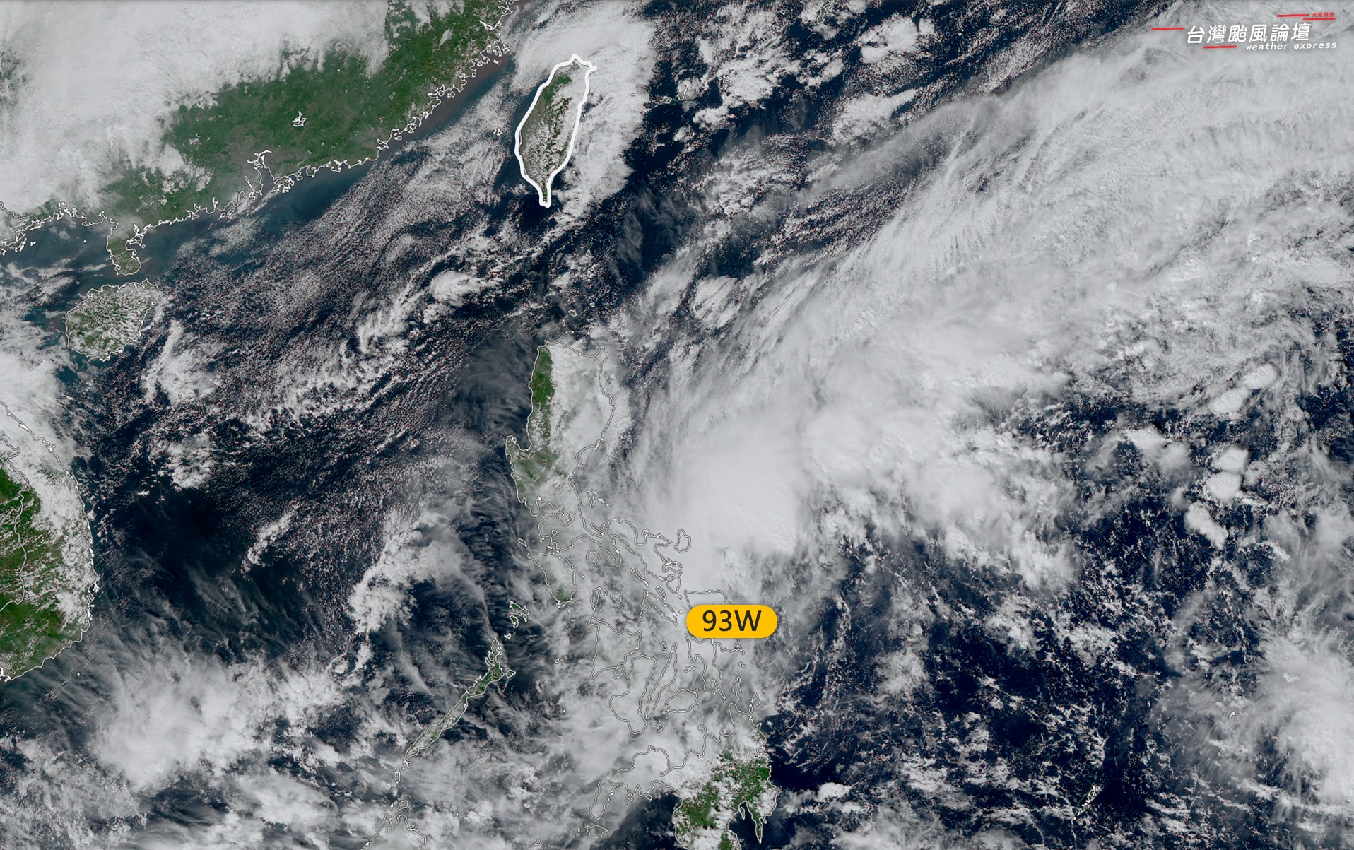 熱帶擾動93W位於菲律賓東方海域,已於今天上午8時增強為熱帶性低氣壓。圖/取自「台灣颱風論壇|天氣特急」臉書粉專
