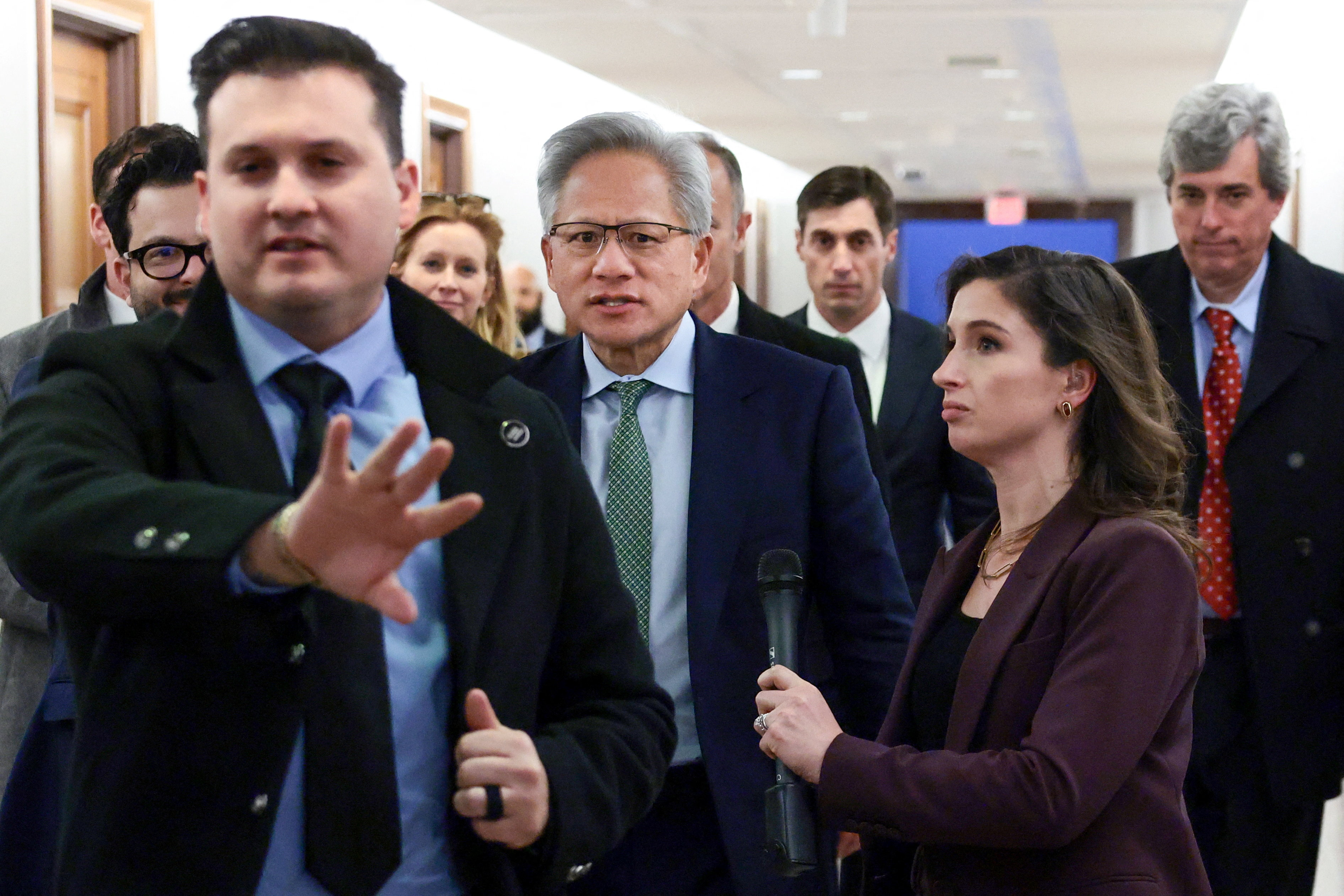 美參院提案要防堵行政部門鬆綁對中國的晶片出口禁令。圖為輝達執行長黃仁勳(中)3日準備與參院銀行委員會會面。路透