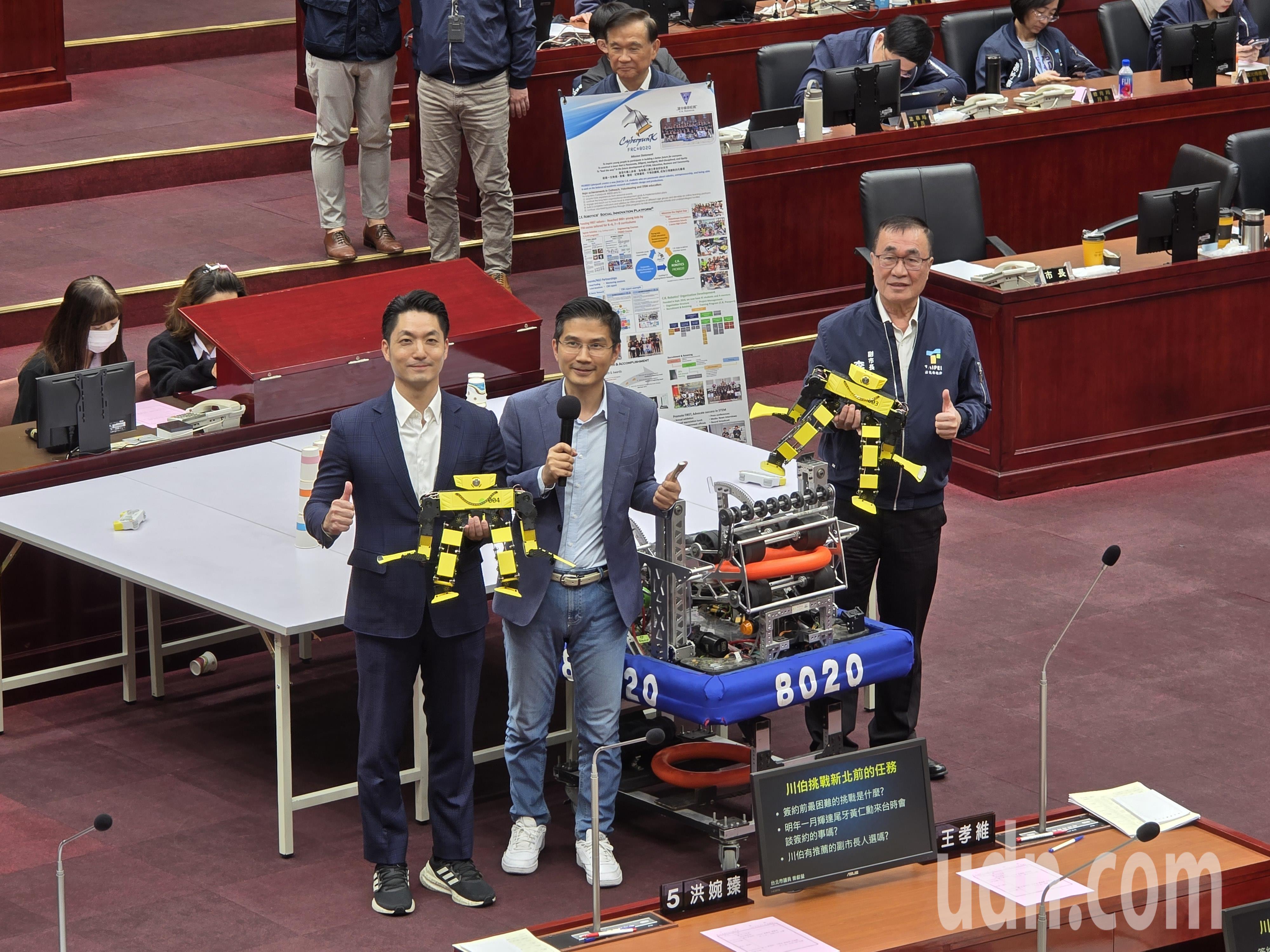 曾獻瑩拿北市高中生們製作的機器人與台北市長蔣萬安(左)、副市長李四川(右)合影。記者邱書昱/攝影