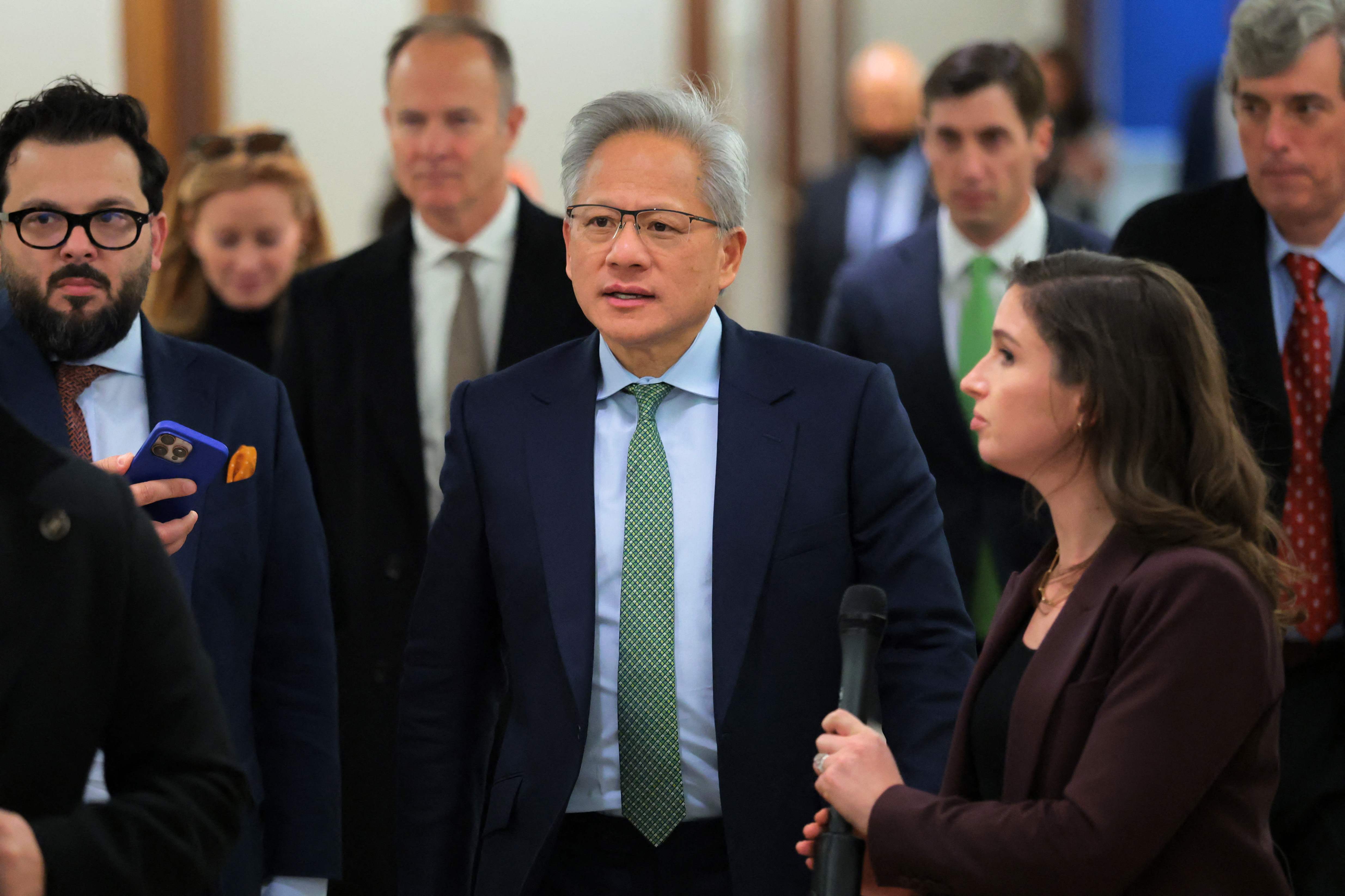 輝達執行長黃仁勳(中)3日抵達美國國會山莊,準備拜會參議院銀行委員會時受訪。法新社