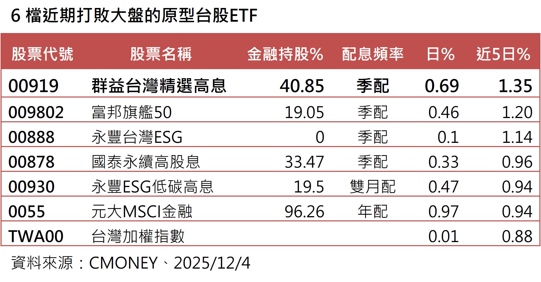 6檔近期打敗大盤的原型台股ETF。(資料來源:CMONEY、2025/12/4)