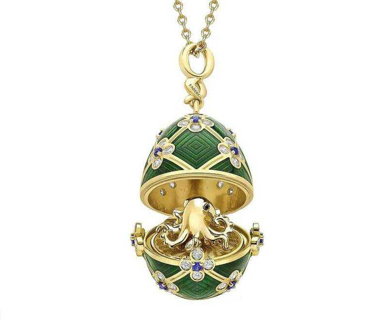 該吊墜為Fabergé與電影元素結合的限量設計商品,靈感源自1983年詹姆斯龐德(James Bond)系列電影《八爪女》(Octopussy),劇情圍繞一樁珠寶竊案展開。據官方描述,這枚限量僅製50枚的吊墜由18K黃金打造,綠色琺瑯外殼上飾有雕花紋路,鑲嵌60顆白鑽與15顆藍寶石,內部則藏有一尊鑲嵌黑鑽雙眼的迷你八爪魚,市值高達3萬3585美元(約新台幣105萬元)。