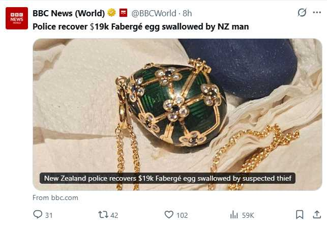 紐西蘭奧克蘭市中心日前發生一起離奇珠寶竊案。一名32歲男子涉嫌在珠寶店行竊後,當場將價值逾百萬台幣的Fabergé限量版吊墜吞下肚,試圖藏匿贓物。警方在數分鐘內趕抵現場並將男子逮捕,經過6天監控後,成功「以自然方式」尋回這枚珠寶。