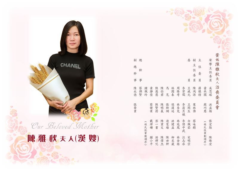 「關渡王」漢哥黃正雄的遺孀,江湖人稱「漢嫂」的陳雅秋上個月(11月)24日,因不熟路況加上夜間視線不佳,將車子開進磺港漁港內墜入海裡意外辭世,將於本月(12月)21日舉行告別式,治喪委員會名單今天曝光,由立委吳思瑤、洪孟楷及蘇巧慧等擔任榮譽主委、新北市議長蔣根煌擔任主委,市議員蔡錦賢擔任總幹事,涵蓋朝野民代,由於漢嫂宛如鄰家大姊、急公好義、助人無數,猝逝令親友扼腕、痛惜,治喪名單全由雙北民代擔任,表達親友對外導正,誤傳漢嫂為黑幫的刻板印象。