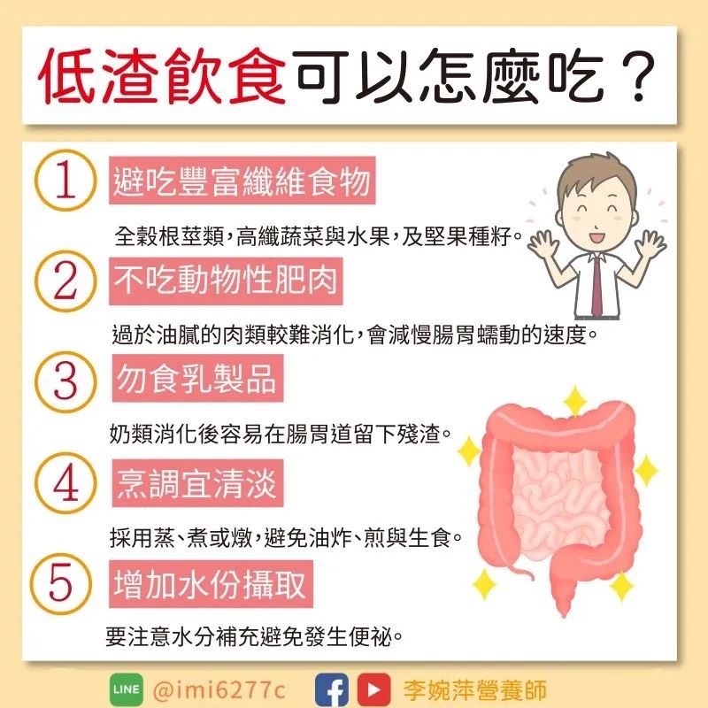 李婉萍說明低渣飲食的部分,要減少糞便體積和腸道中有「殘渣」,建議可吃「烹調方式清淡」的食物,避免油炸、油煎與生食;還有「避開含豐富纖維的食物」例如燕麥、糙米等全穀根莖類,還有高纖蔬果、堅果種子;也建議「不吃動物性肥肉」,它們過於油膩較難消化,會減慢腸胃蠕動的速度,應選擇去皮、不帶筋、口感較嫩的肉類。