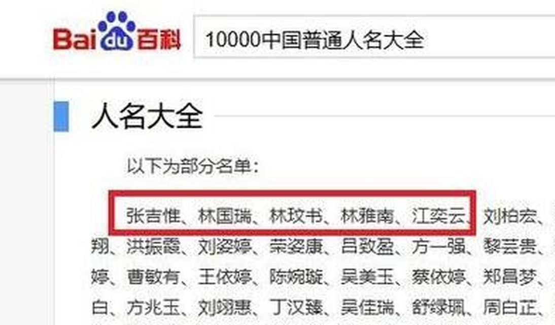 中國多地官方公告、獲獎名單、處罰名單與公開資訊,頻繁出現同一組名字(紅框處),竟來自百度文庫的「10000中國普通人名大全」。(取材自百度)